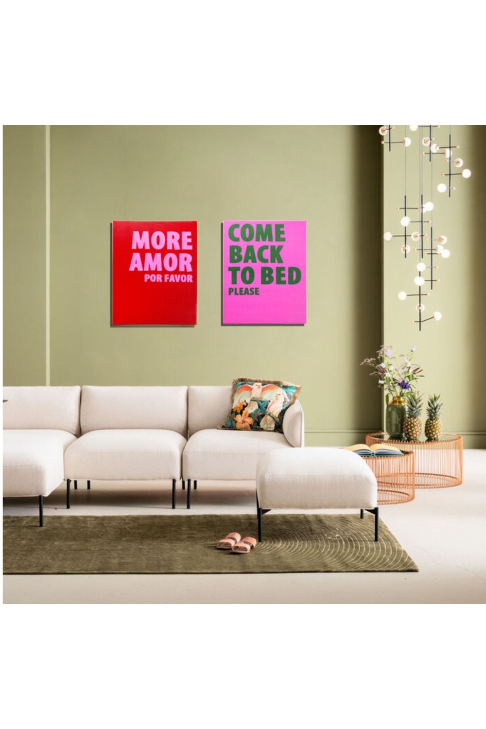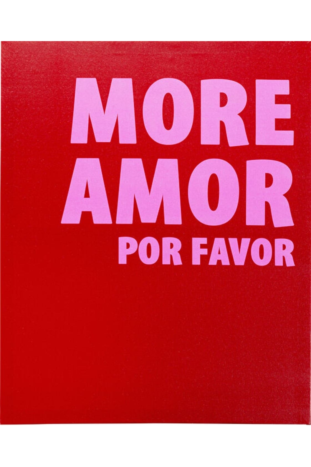 Ce joli tableau sur fond rouge, avec son écriture en rose, porte un message " MOR AMOR POR FAVOR", qui signifie " PLUS D'AMOUR, S'IL VOUS PLAIT".