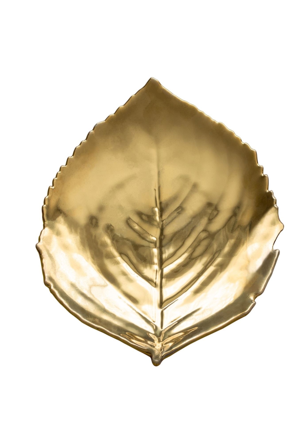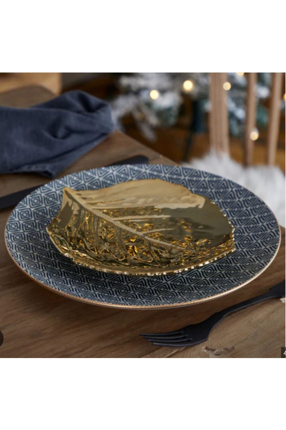Sublimez vos tables de fête avec nos assiettes en grés en forme de feuille d'hortensia, dorées et fabriquées au Portugal.
