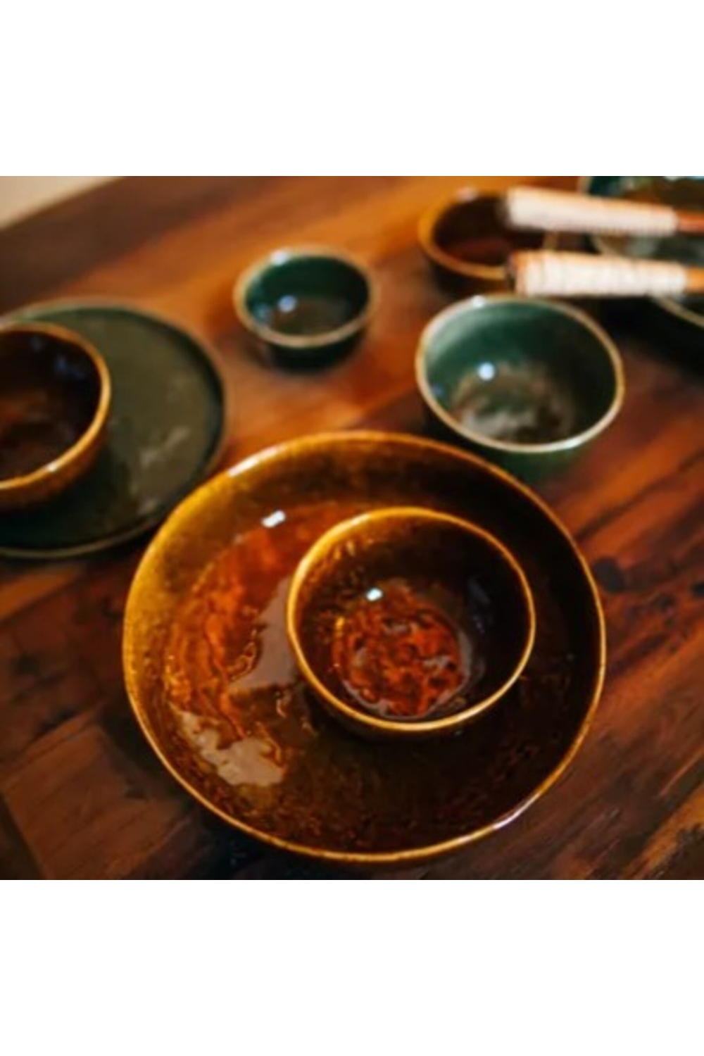 - Vert foncé, il arbore une nuance de vert kaki profond, aux accents naturels et terreux. L'émail réactif lui donne un aspect légèrement nuancé, avec des reflets allant du vert olive foncé à des touches plus sombres proche du brun vert, créant un effet visuel riche et organique.