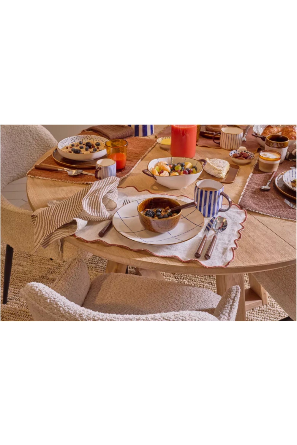 Inspirées par l’île grecque, elles se distinguent par leurs petits pois bleus, créant un beau contraste avec les assiettes à rayures bleues.