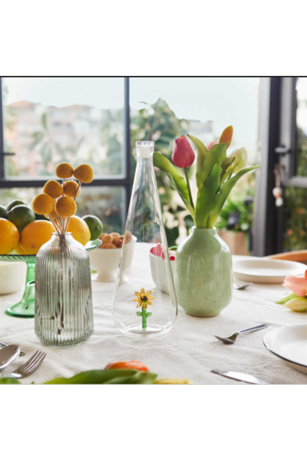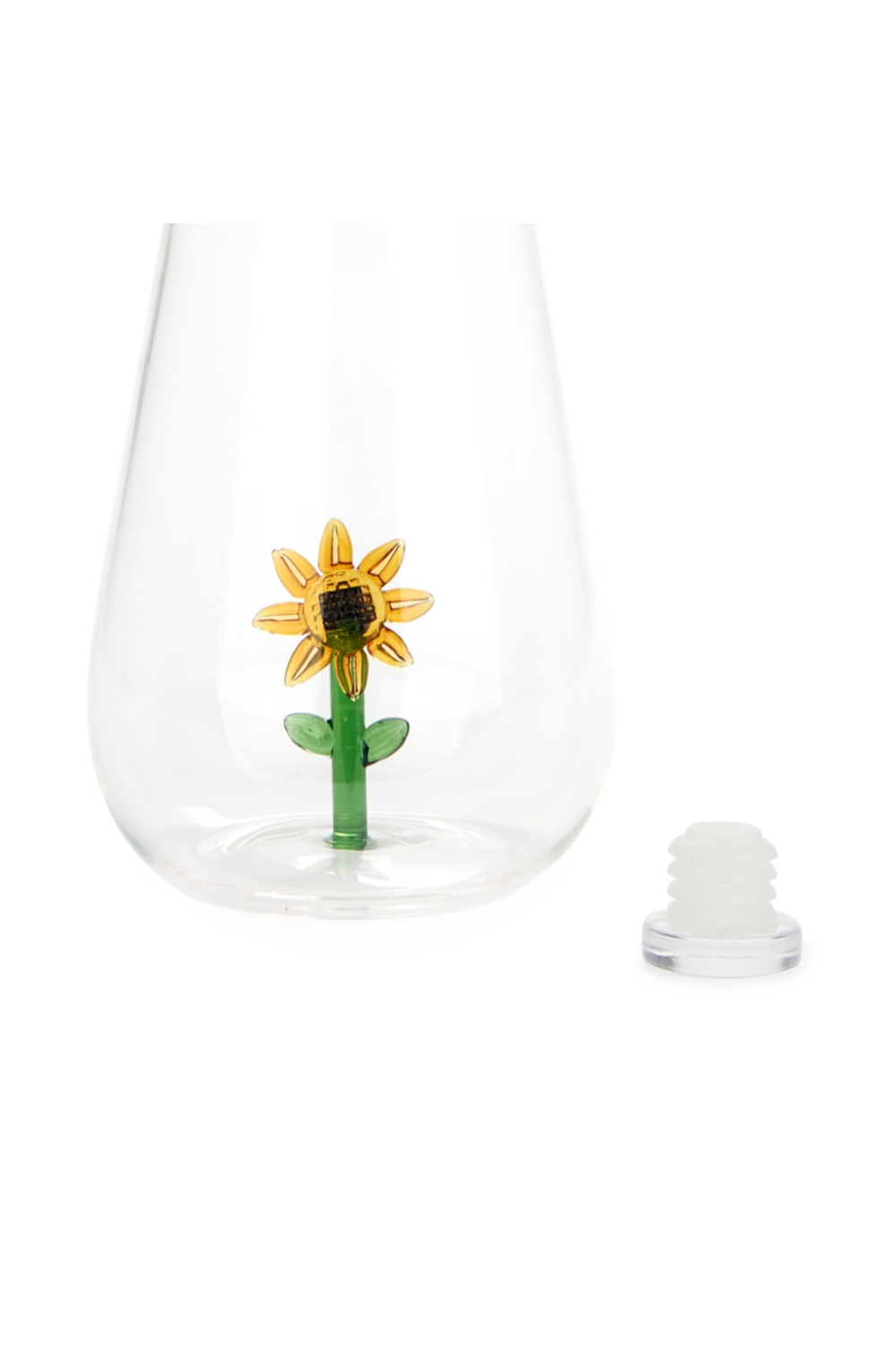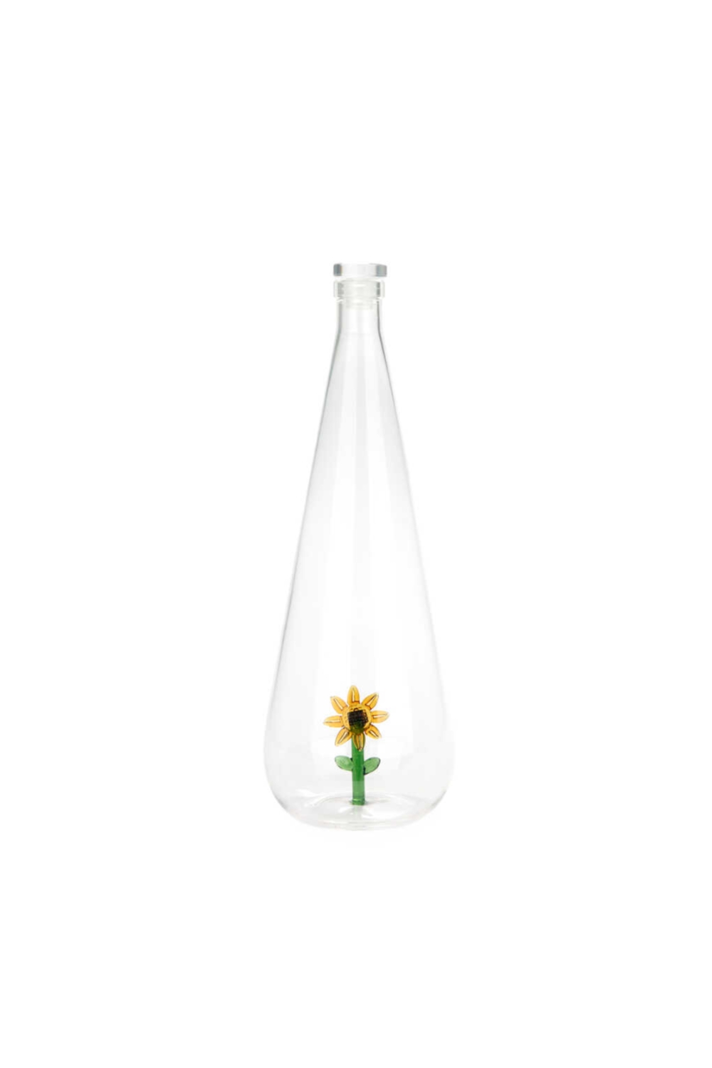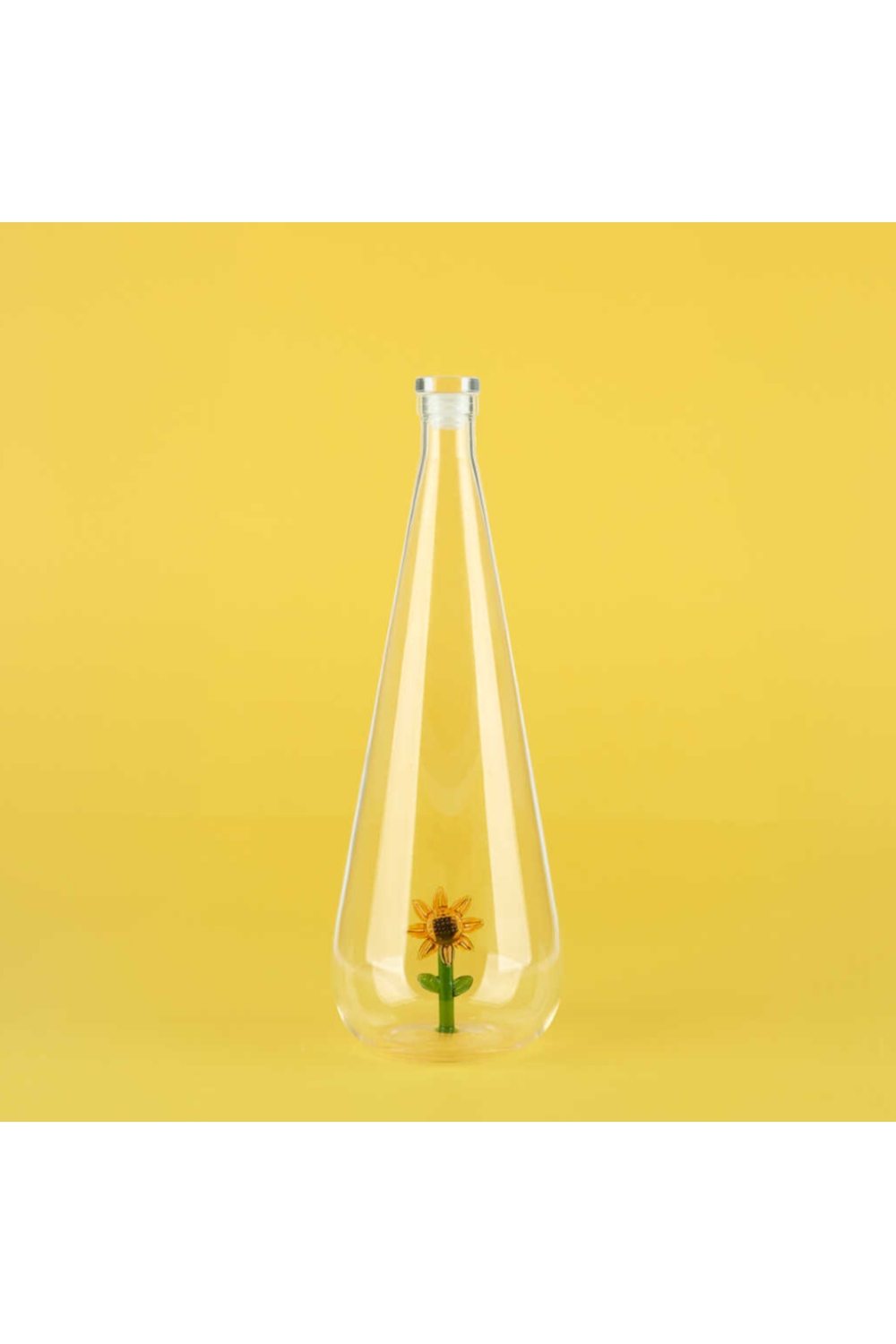 Offrez ou offrez-vous une touche de poésie et de fraicheur avec notre carafe bouteille en verre borosilicate, ornée d'un tournesol fait main à l'intérieur.