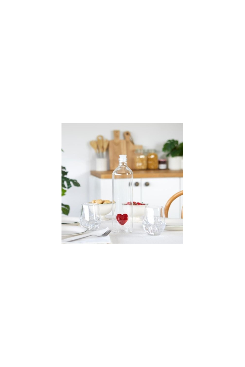 Ici, la carafe à eau "LOVE" et son coeur en verre coloré rouge à l'intérieur, avec un bouchon en silicone.