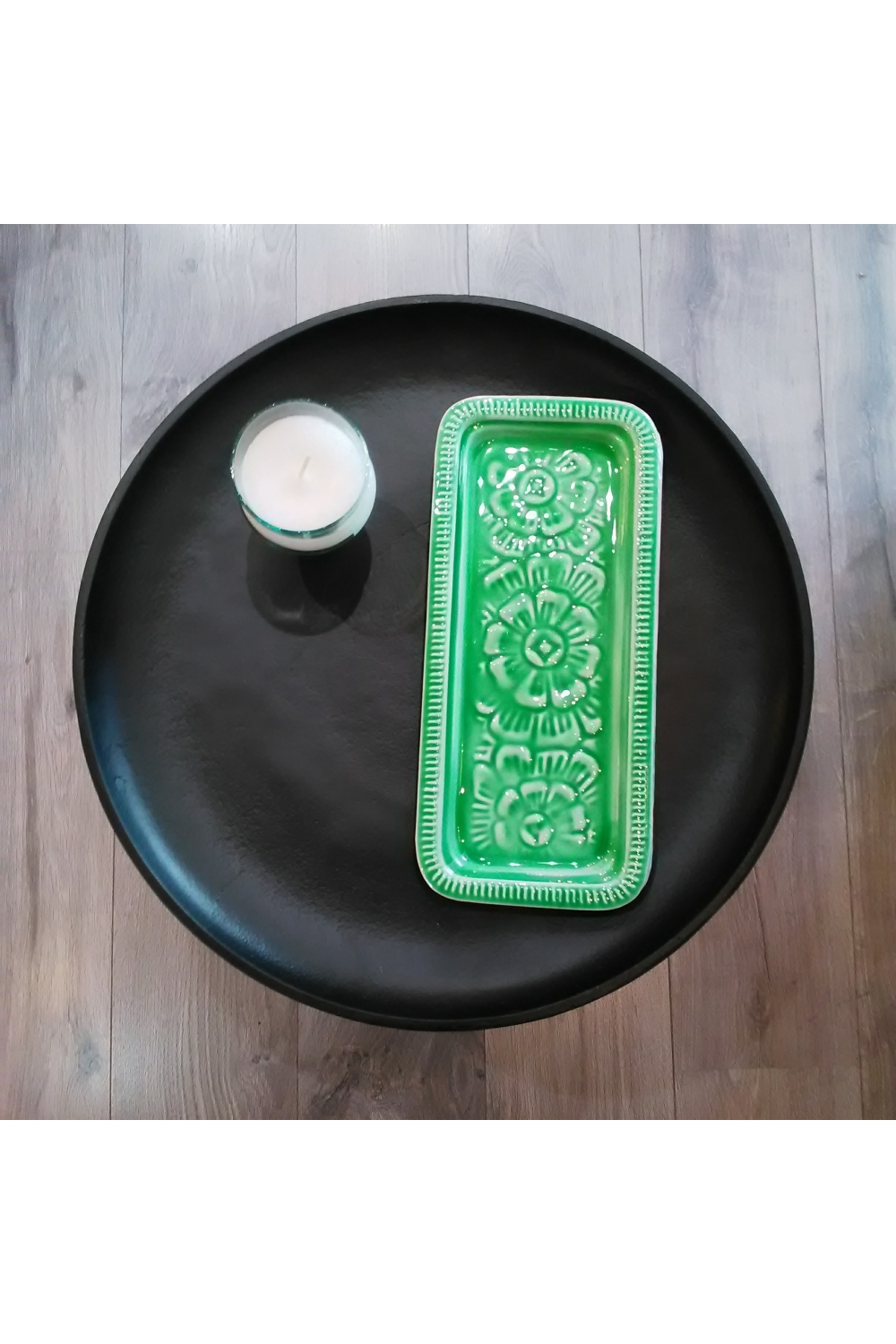 Ici, le plateau berbère rectangle en métal émaillé PM vert sera le compagnon idéal de vos apéros et petits déj à 2 !