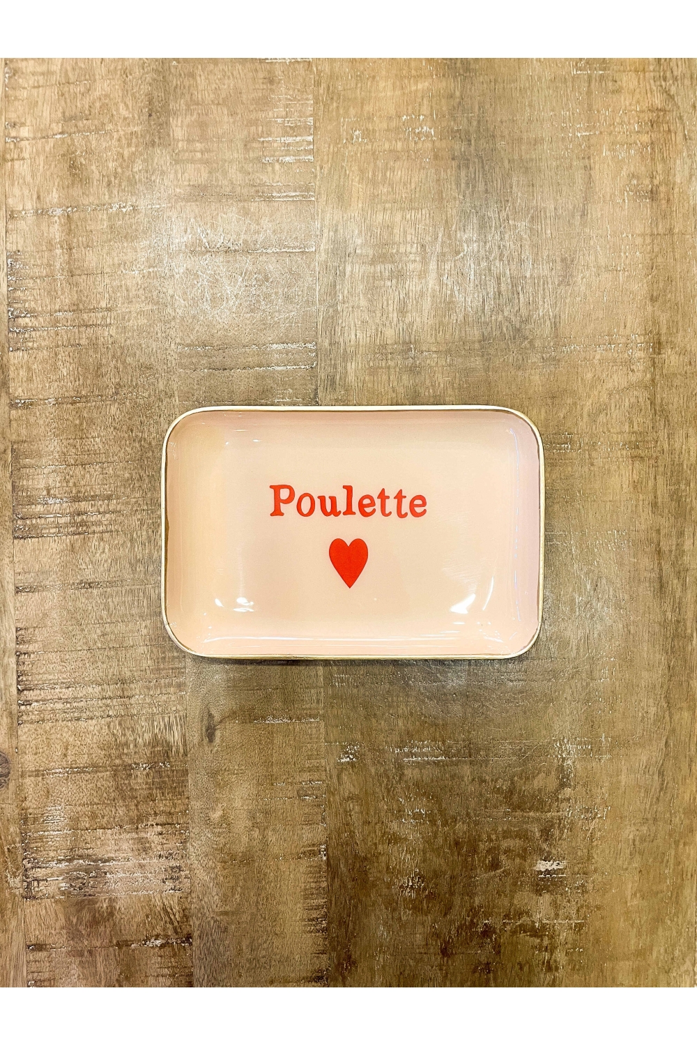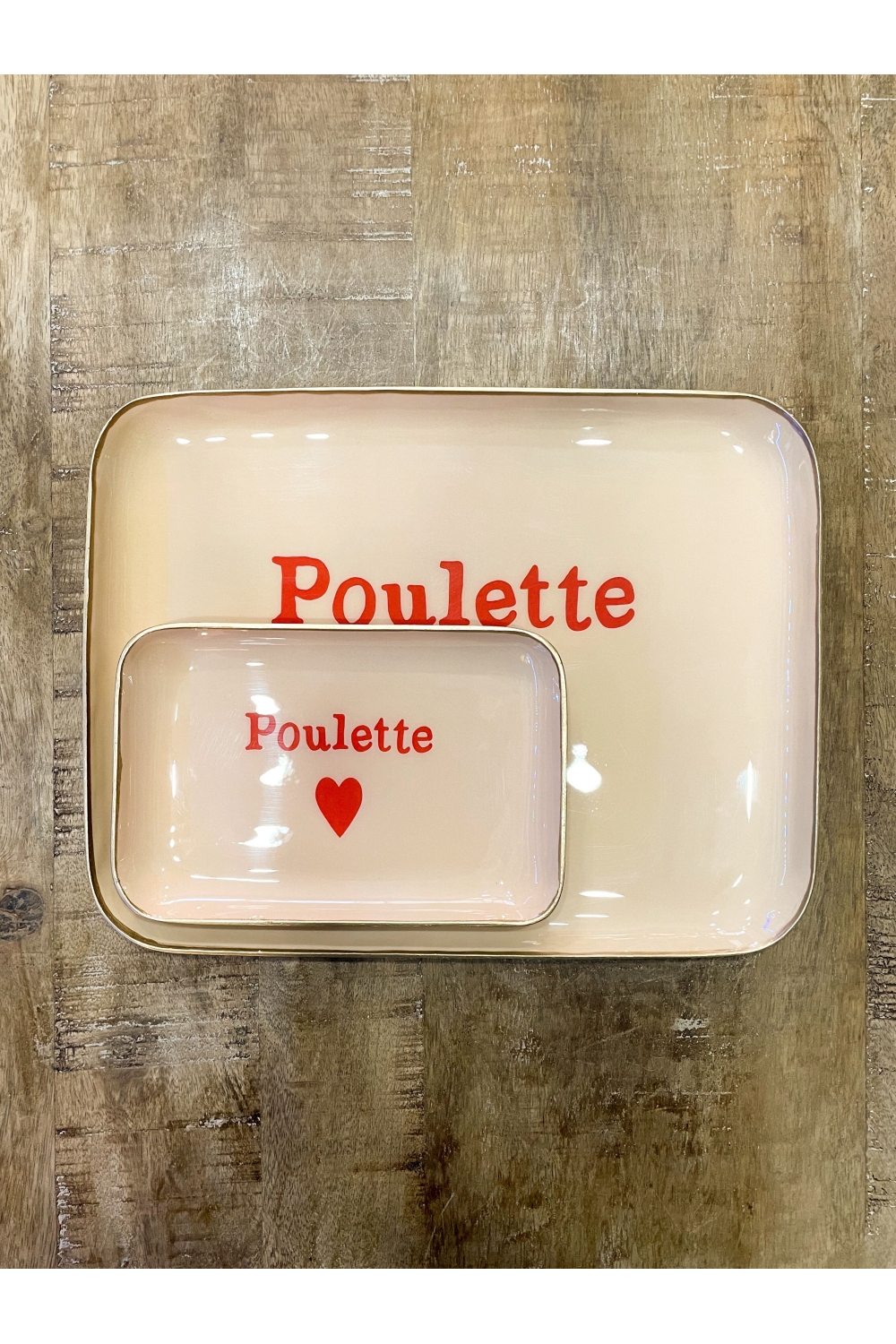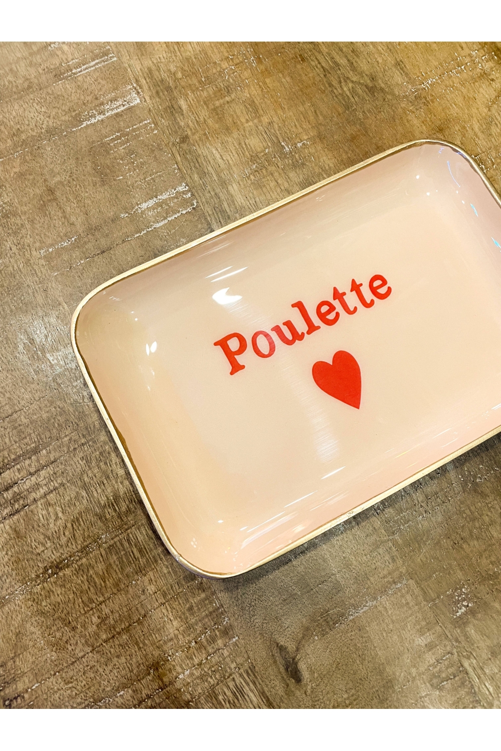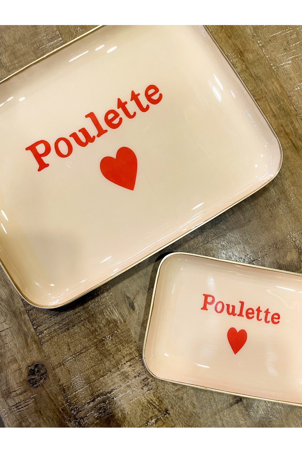 Craquez pour le plateau Poulette, un accessoire charmant en métal émaillé, orné d'un petit coeur rouge et d'un mot tendre qui fait sourire. Idéal à offrir ou à s'offrir, il existe en plusieurs dimensions et apporte une touche de délicatesse à chaque occasion.
