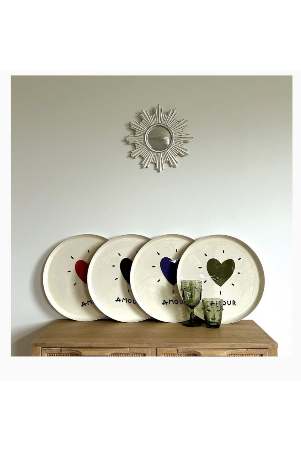 Découvrez nos jolis plateaux métalliques, diamètre 35 cm au fond crème, ornés d'un cœur coloré et du mot " AMOUR". Disponibles en quatre couleurs, ils apportent une touche de tendresse et de gaieté à votre intérieur.