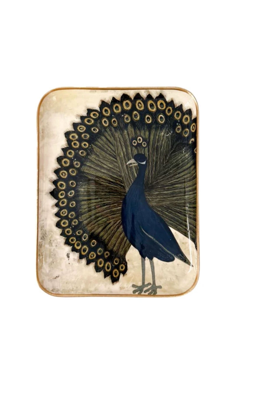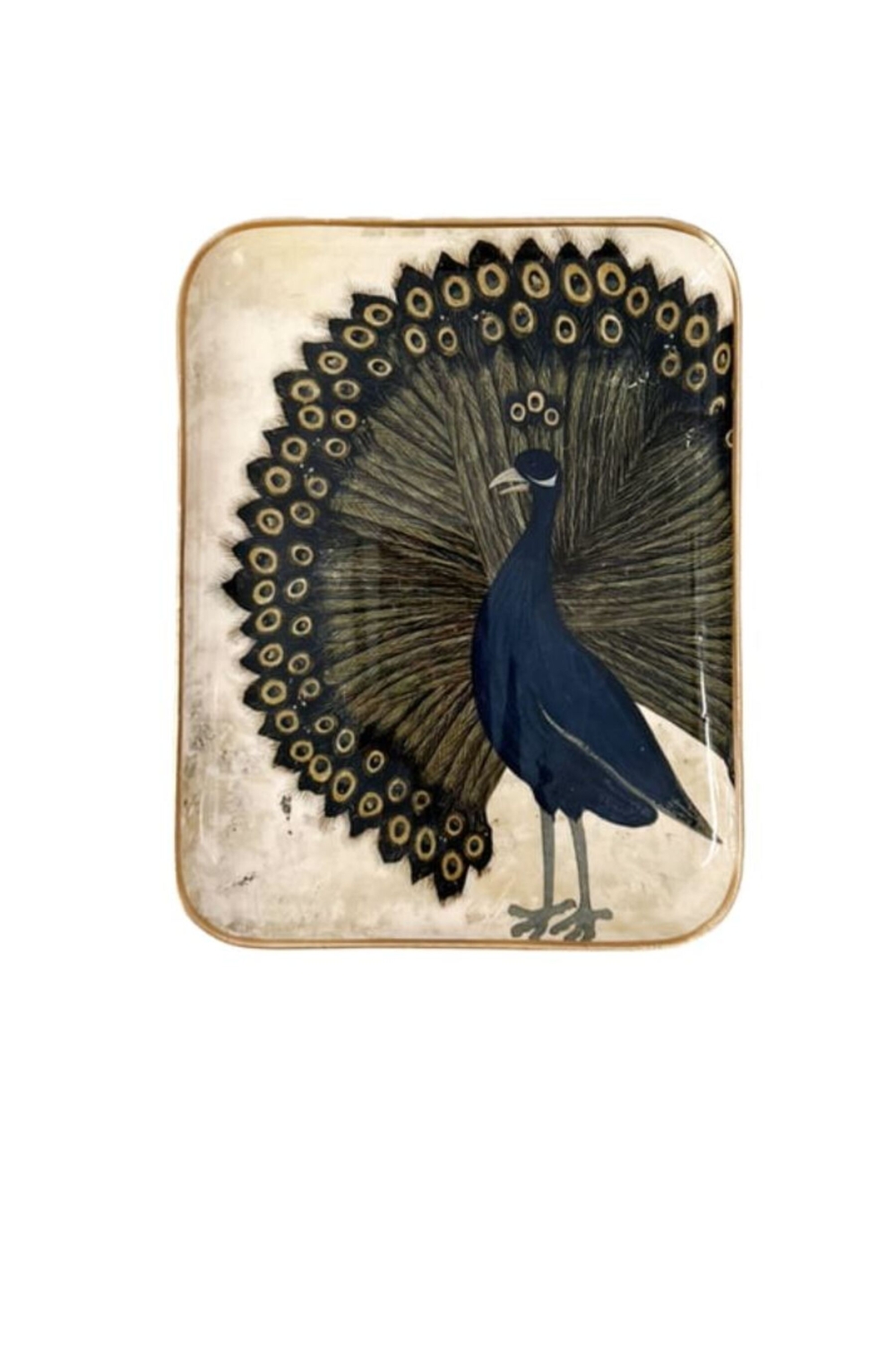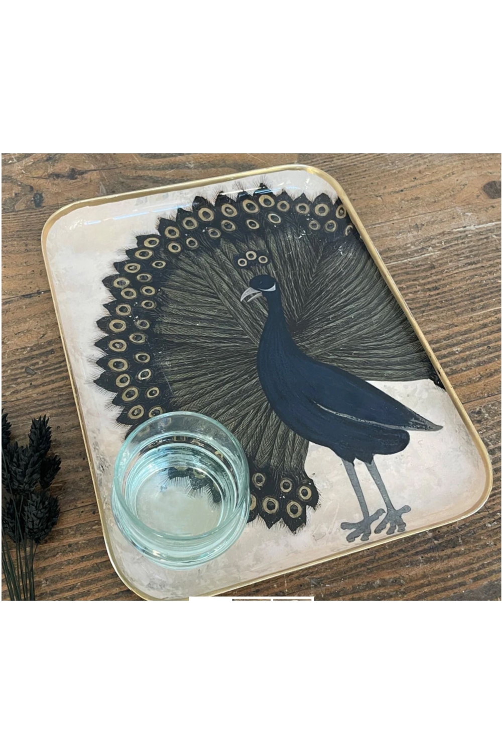 Plateau rectangulaire 24,5cm x 19 cm en aluminium émaillé - imprimé "Paon"