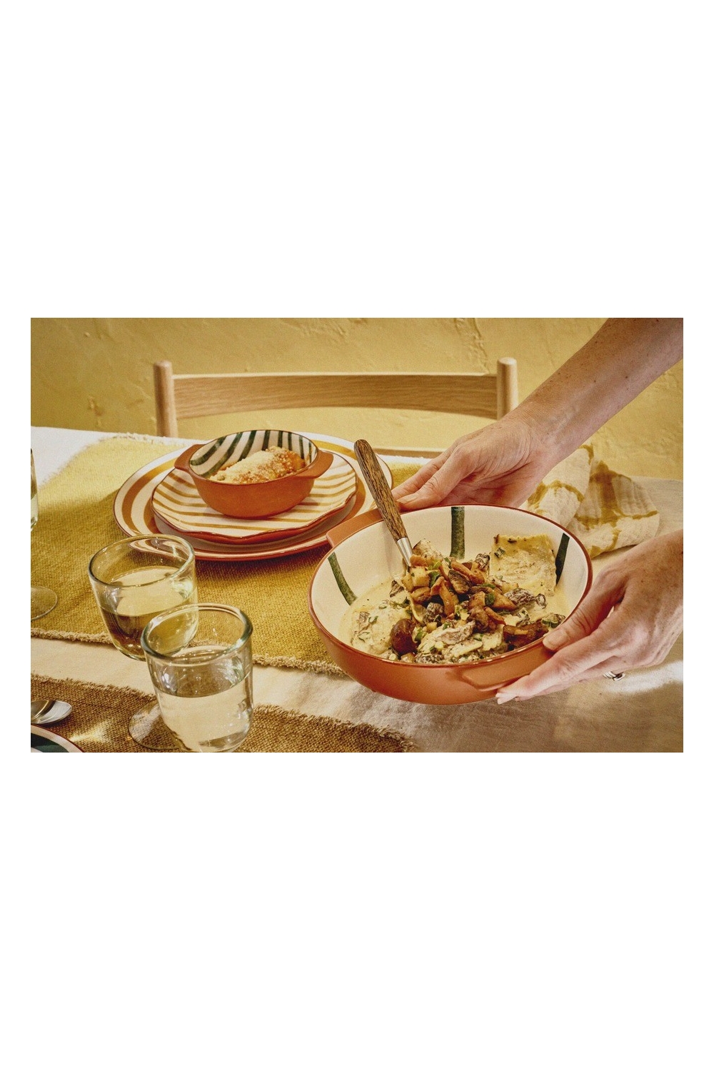 Leur teinte évoque les paysages ensoleillés et les nuances de la terre cuite, tandis que leur finition naturelle rappelle la beauté brute de l'île. Ces assiettes sont conçues pour être mélangées entre elles ou associées aux autres couleurs de la collection Mykonos, offrant ainsi une table aux accents méditerranéens uniques.