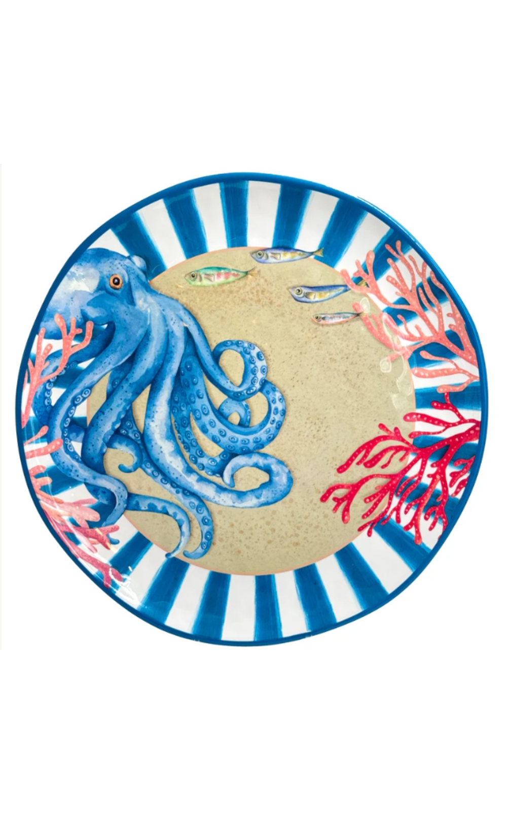 Apportez la Méditerranée à votre table avec ce grand plat à servir, véritable tableau marin. Son décor riche et détaillé représente un aquarium vivant avec son majestueux poulpe, coraux et algues, créant un rendu à la fois poétique et spectaculaire.