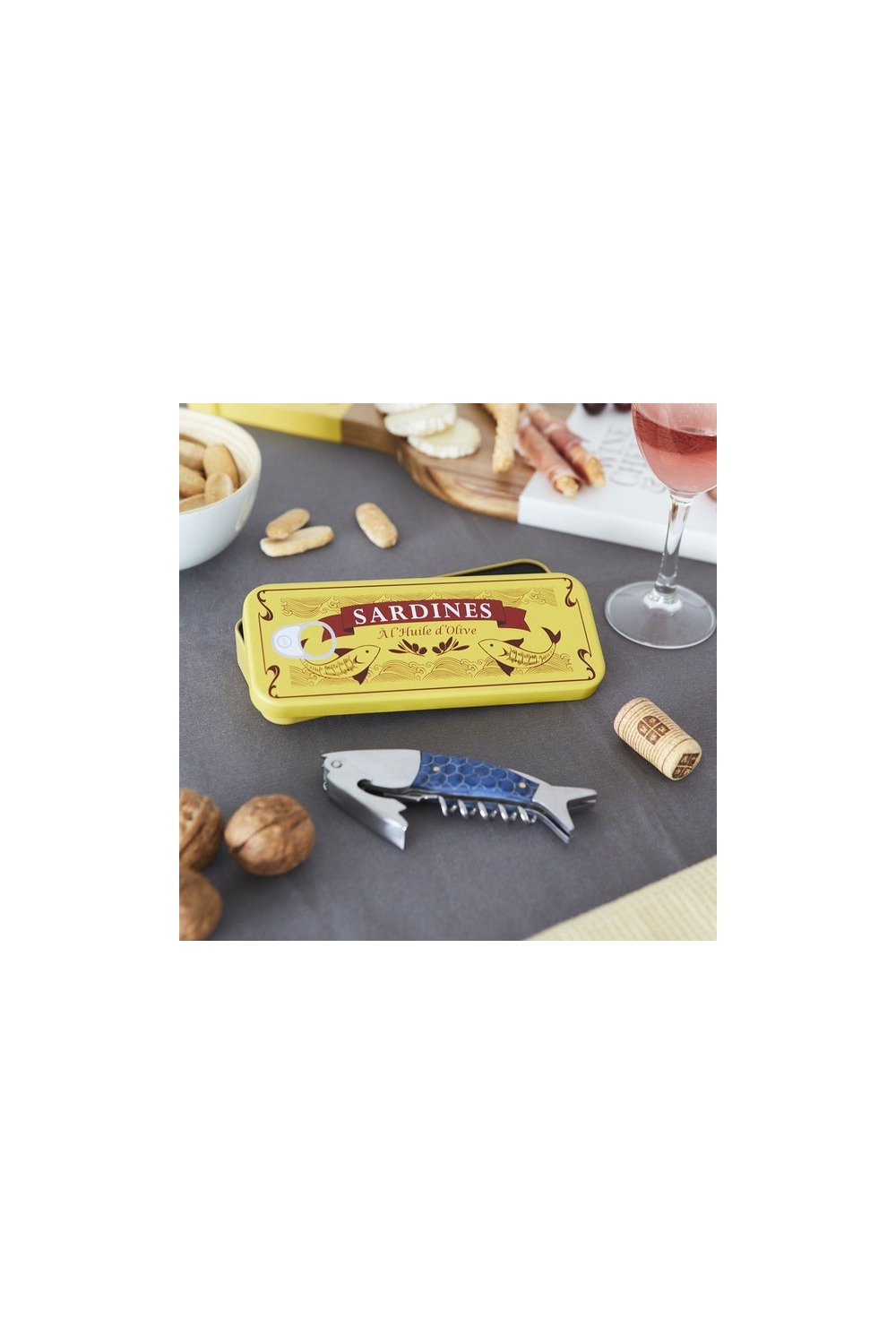 Ha! Qu'est-ce qu'on est serré, au fond de cette boîte chantent les sardines, chantent les sardines... Cet ouvre-bouteille/décapsuleur sera l'allié des fiesta réussies !