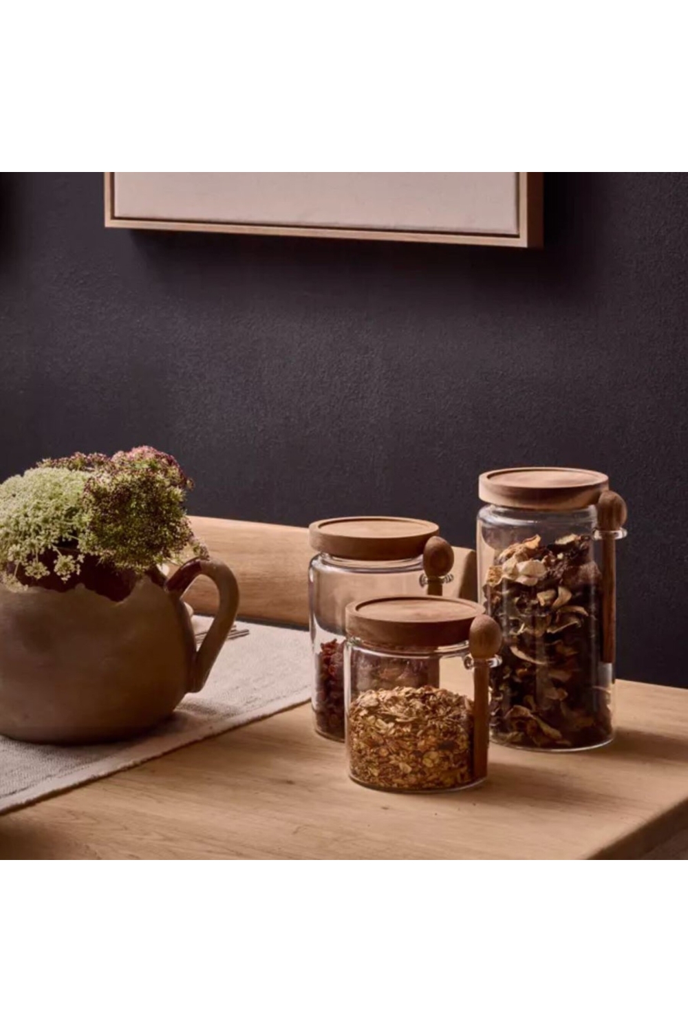 Chaque bocal est équipé d'un couvercle en bois accompagné de sa cuillère assortie, pour un prélèvement facile et pratique des ingrédients.
