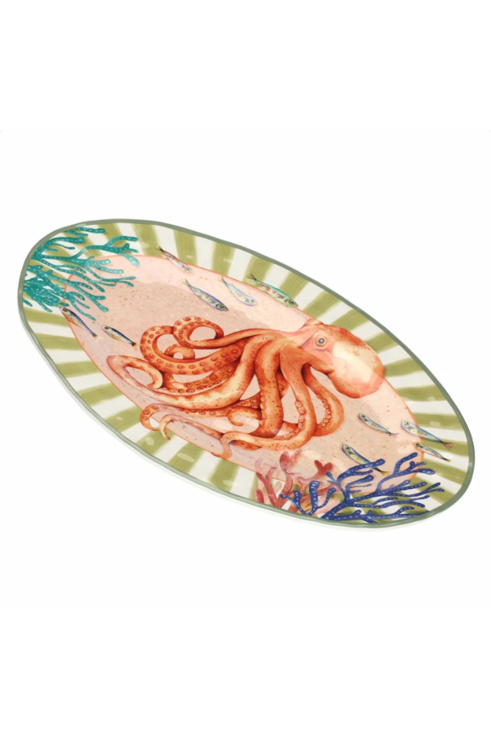 Apportez la Méditerranée à votre table avec ce plateau oval en mélamine de 45x30 cm, véritable tableau marin. Son décor riche et détaillé représente un aquarium vivant avec son majestueux poulpe, coraux et algues, créant un rendu à la fois poétique et spectaculaire.
