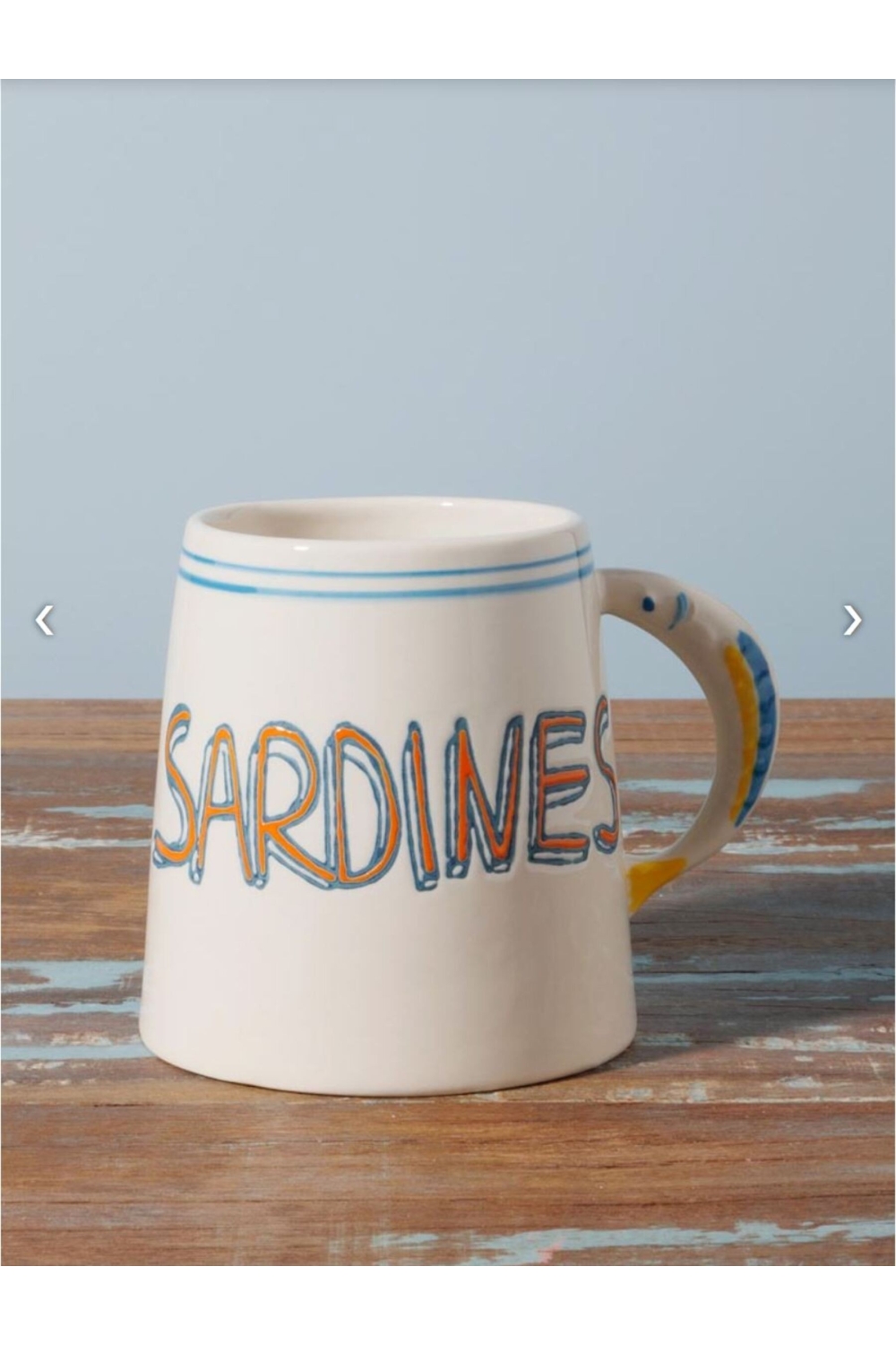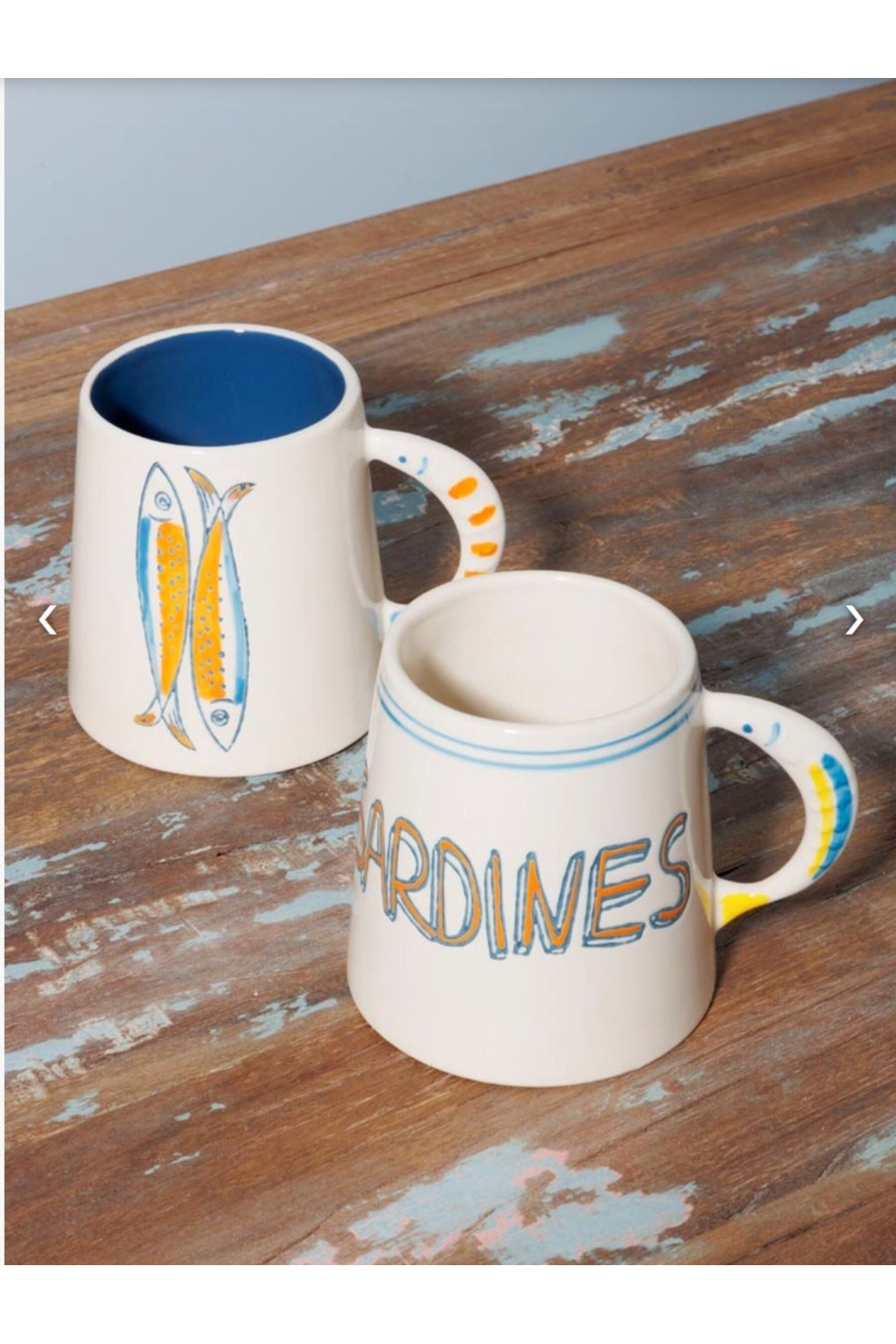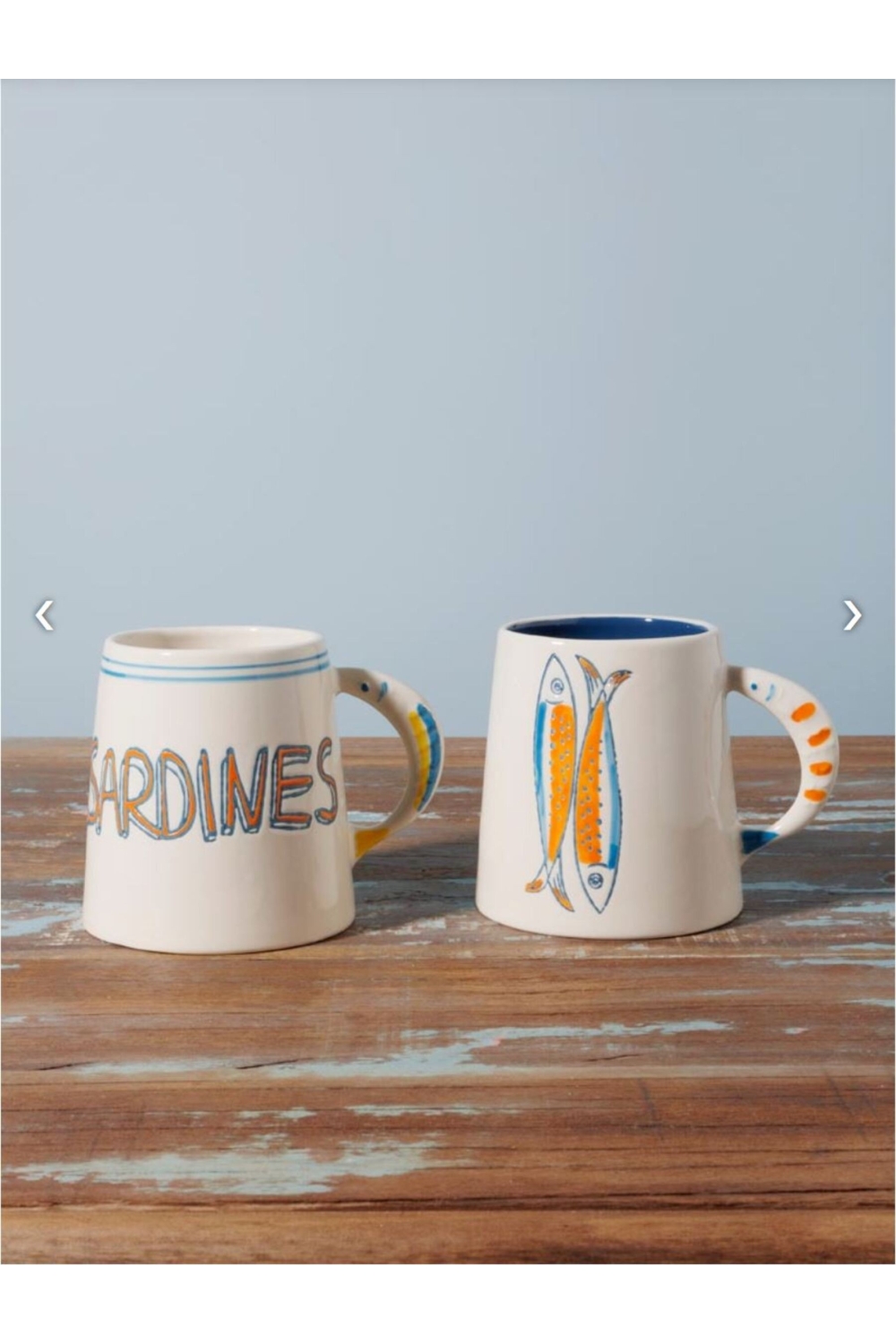 Sur l'un des mug une jolie sardine stylée prend la pose, tandis que l'autre affiche simplement le mot sardine coloré, en clin d'œil à ce symbole incontournable de la ville.