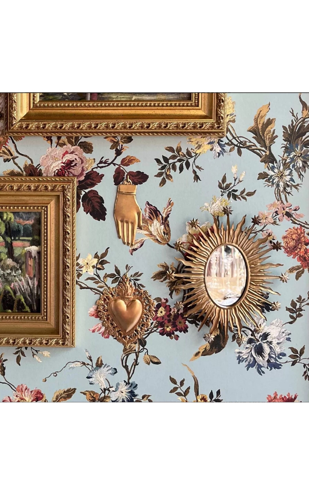 Accumulez coeur ex-votos, ornements et miroir pour une composition murale réussie.
