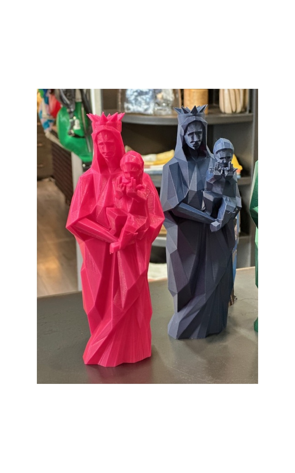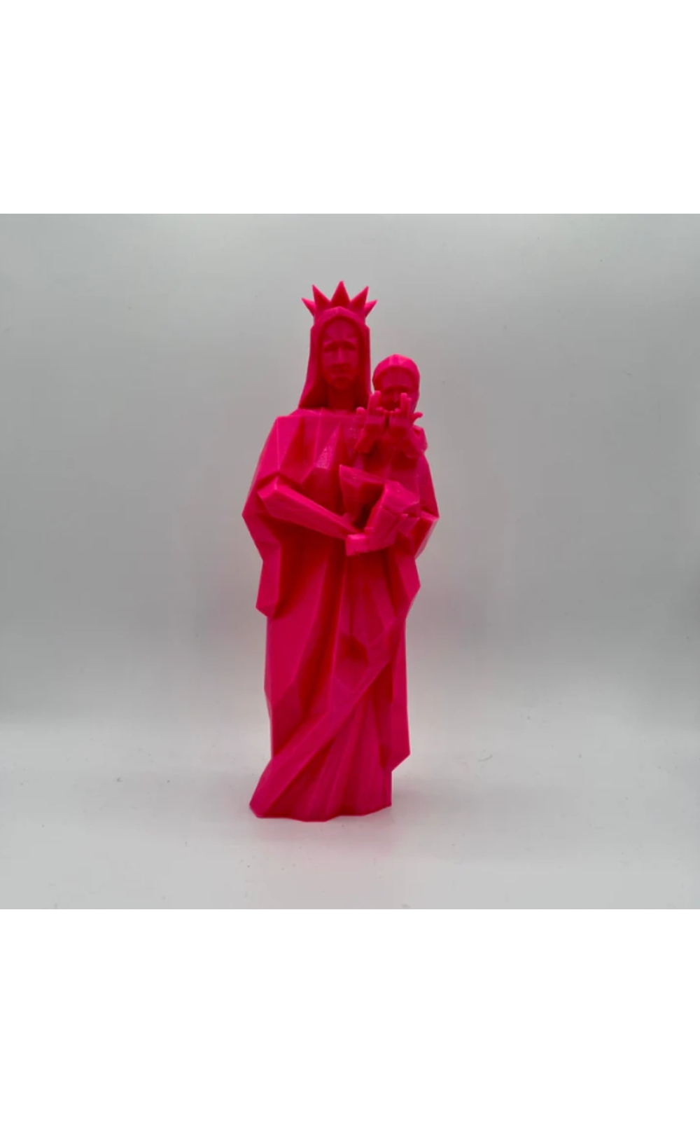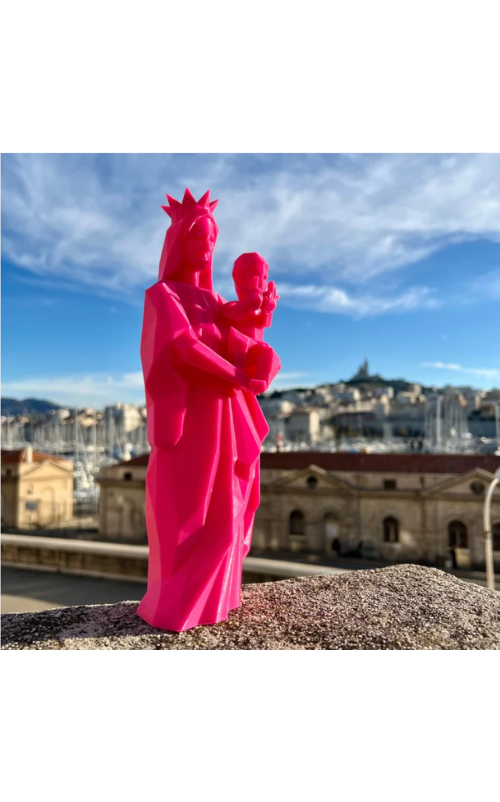 Son petit jésus fait le signe de JUL, un clin d'oeil assumé à une autre icône Marseillaise. Deux symboles, deux énergies, reunis avec humour. Cette Vierge est made in Marseille, fabriquée à partir de bouteilles en plastique recyclées et réalisée grâce à l'impression 3D. Tradition, modernité et engagement réunis dans une même pièce.