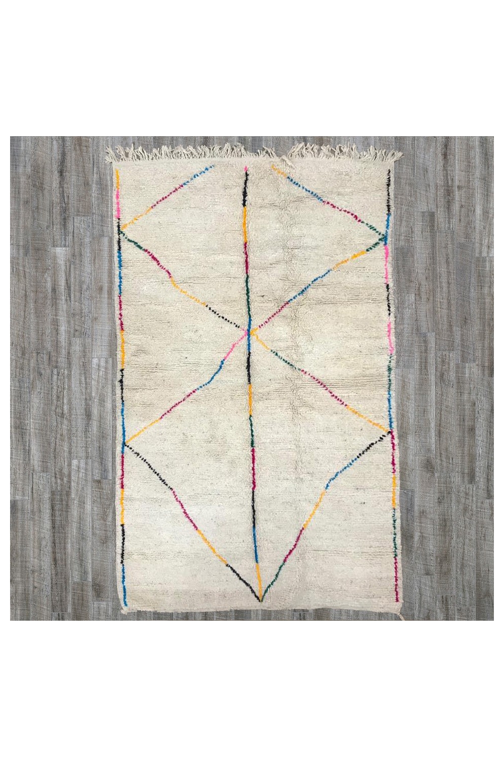Tapis Beni Ouarain, fait main, pièce unique, écru motif losanges multicolores
