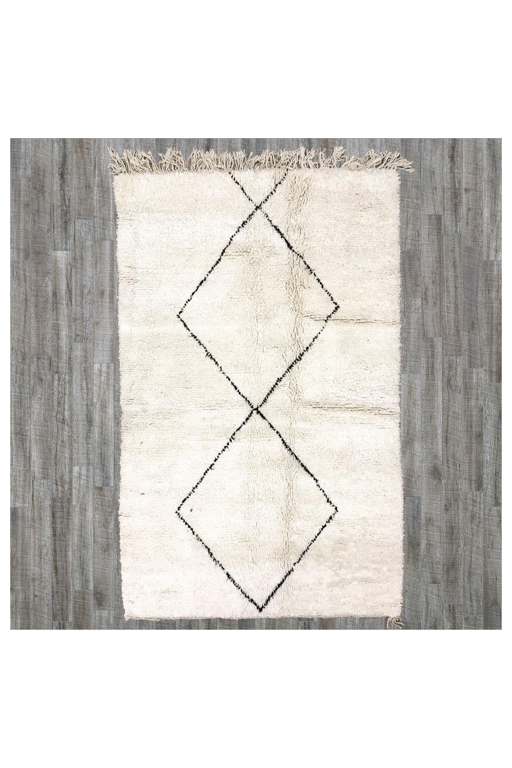 Tapis Beni Ouarain, fait main, pièce unique, écru motif grands losanges noirs