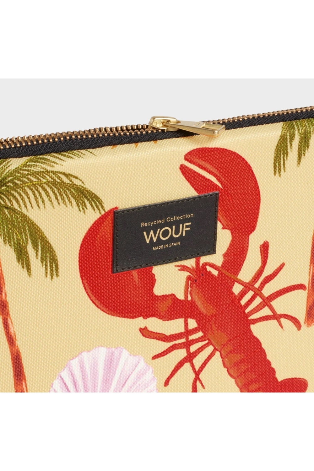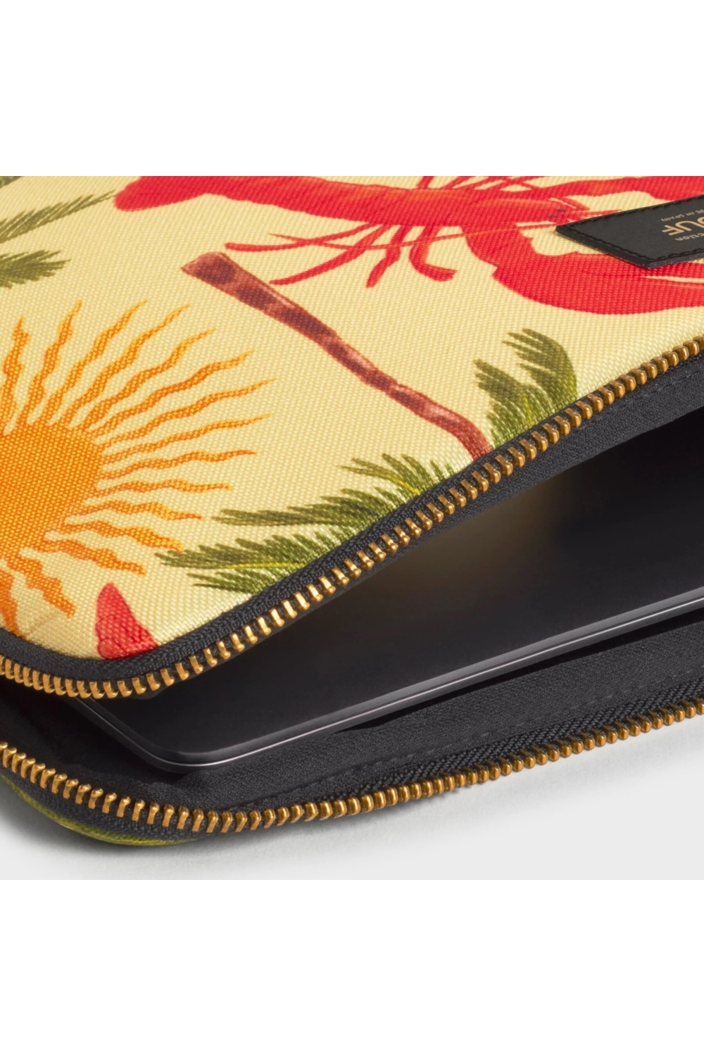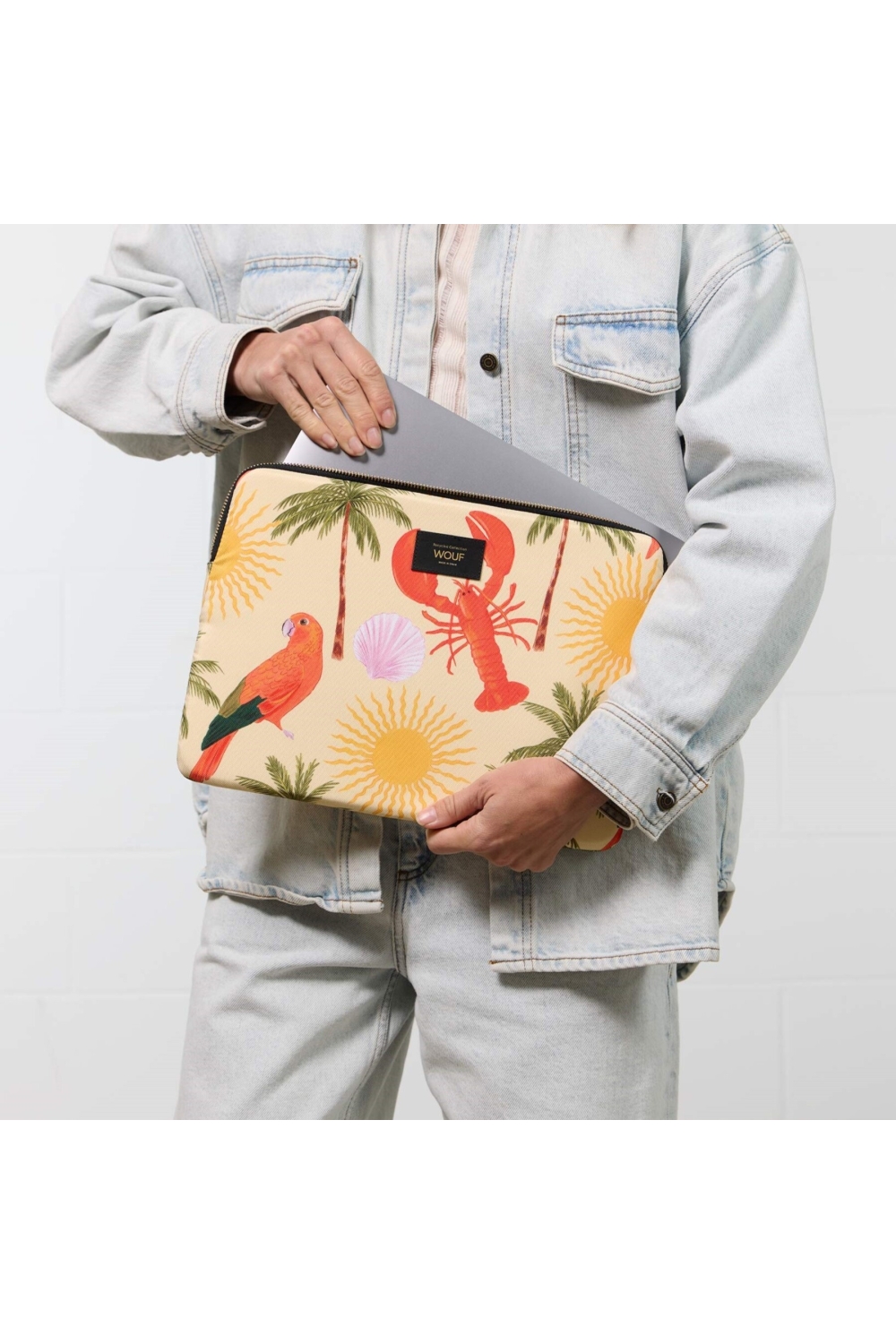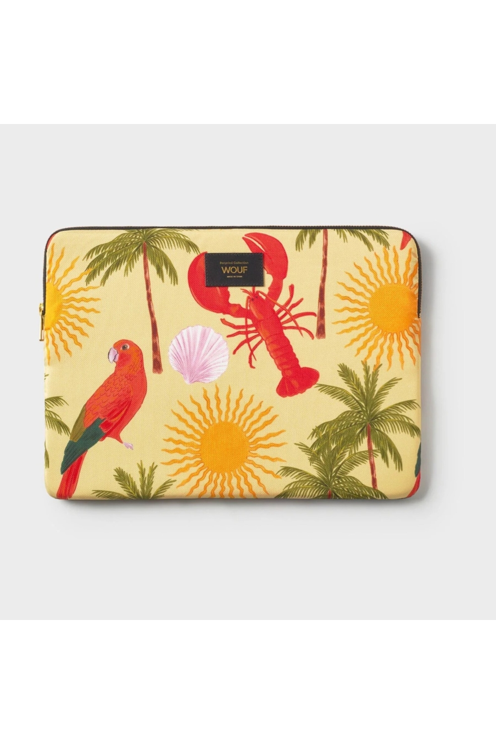 Cette housse pour ordinateur de de la marque Wouf est à la fois pratique et stylée. Son design tropical coloré, avec un homard rouge, un perroquet, des palmiers et des soleils dorés sur un fond jaune clair, apporte une touche estivale et originale.