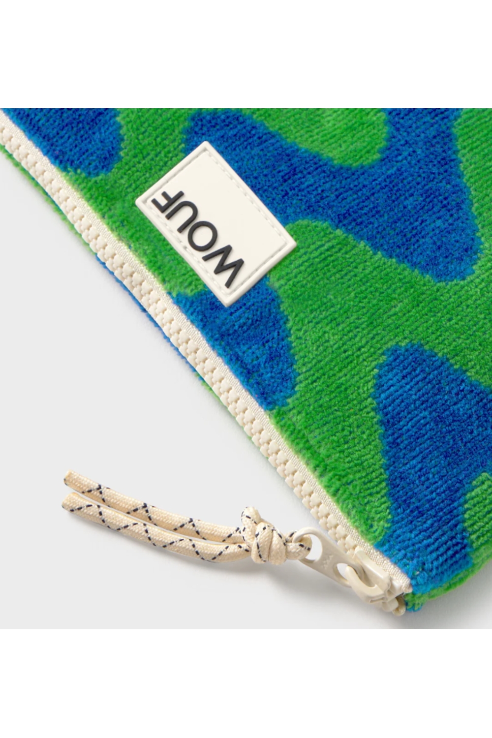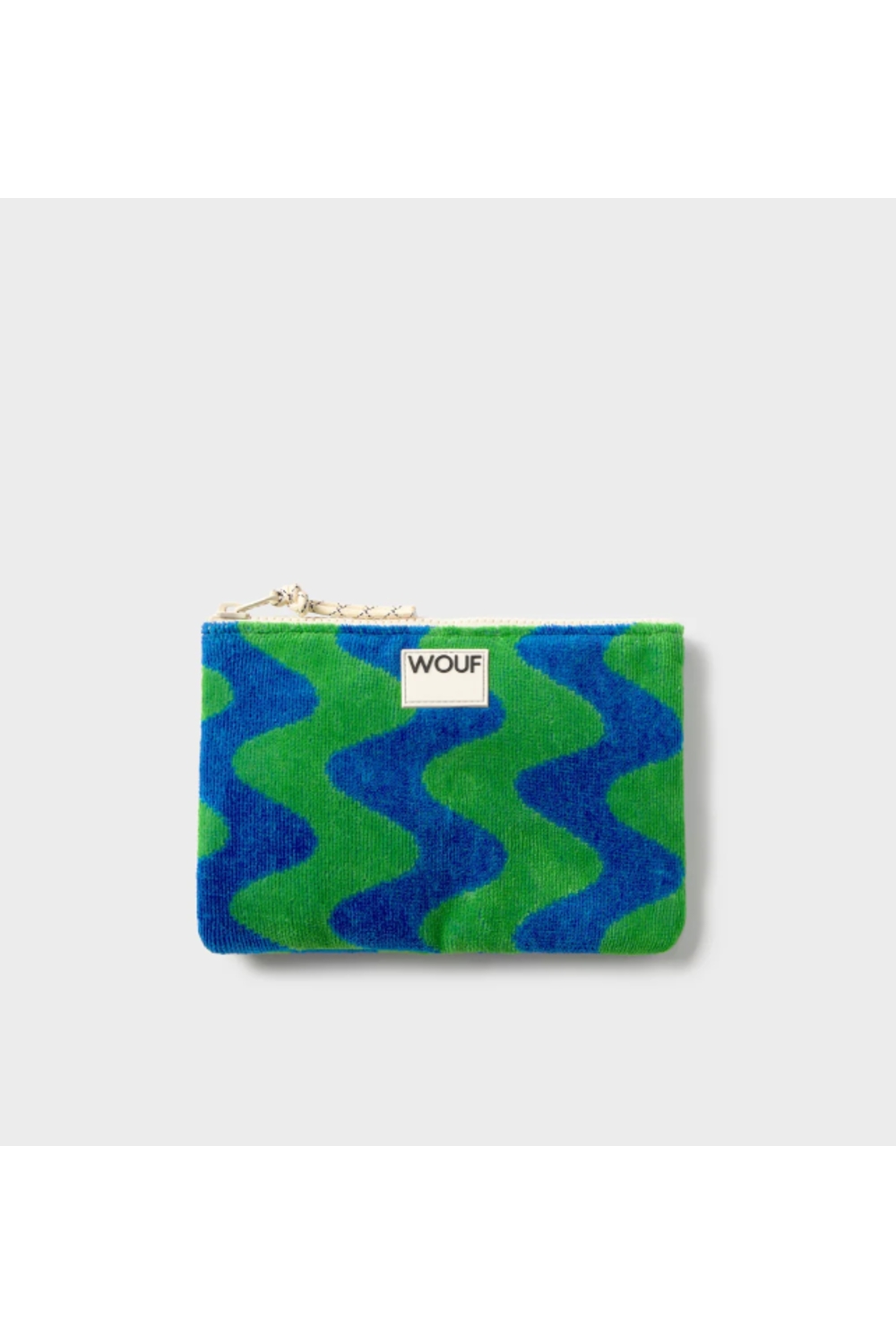 La pochette Goa de chez Wouf, confectionnée en tissu éponge 100 % coton biologique, vous permet de ranger et d'organiser vos essentiels. Son motif vague graphique, composé de lignes alternées vert pétard et bleu Majorelle, crée un effet visuel lumineux et dynamique. Un design frais et joyeux, qui évoque le mouvement, la mer et l'esprit estival. Sa doublure déperlante et son large compartiment en font l'accessoire idéal pour emporter passeport, lunettes de soleil ou téléphone, et elle se glisse facilement dans un sac ou se porte comme sac à main.