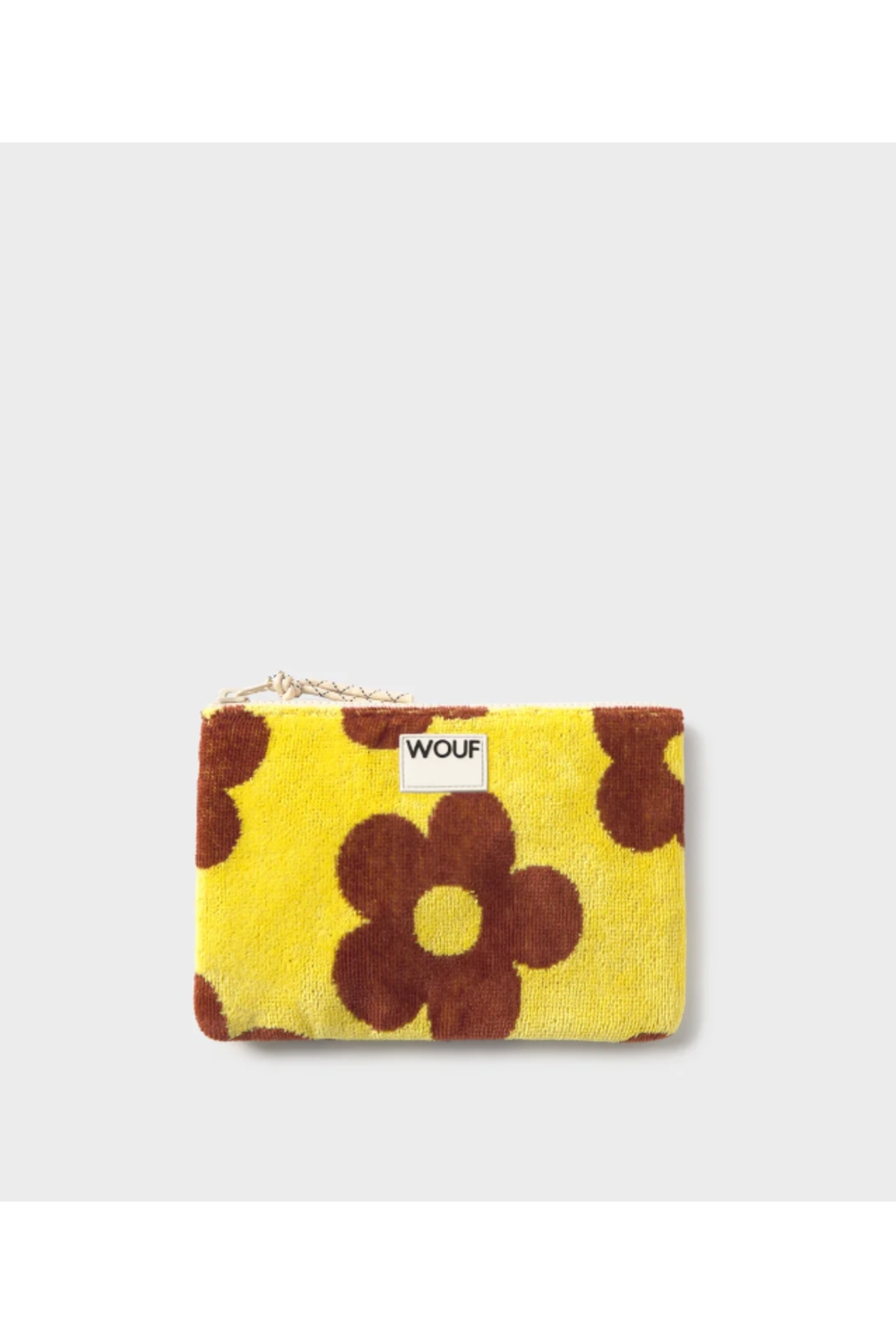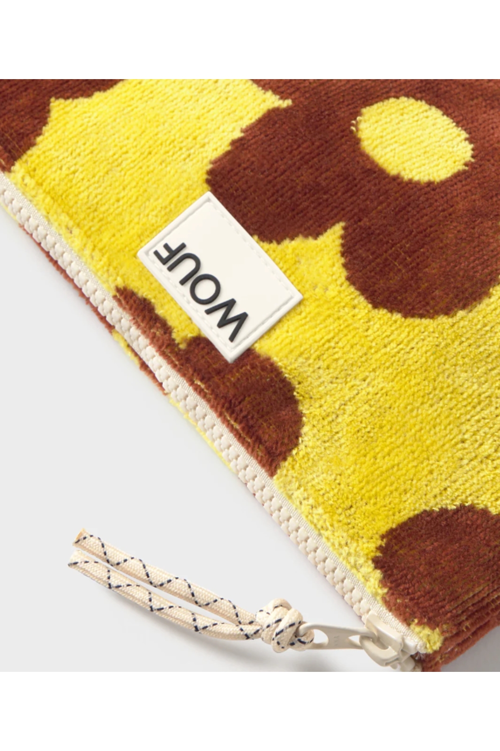 La pochette Phi Phi de chez Wouf, confectionnée en tissu éponge 100 % coton biologique, vous permet de ranger et d'organiser vos essentiels. Son design se distingue par son fond jaune lumineux, rehaussé de grosses fleurs marron aux accents seventies, pour un look rétro assumé, joyeux et plein de caractére. Un veritable concentré de soleil, qui évoque instantanément les vacances, la liberté et la douceur de vivre.. Sa doublure déperlante et son large compartiment en font l'accessoire idéal pour emporter passeport, lunettes de soleil ou téléphone, et elle se glisse facilement dans un sac ou se porte comme sac à main.