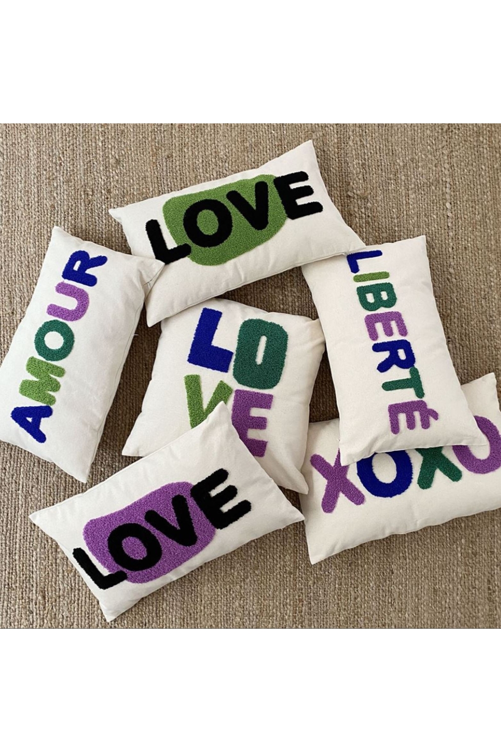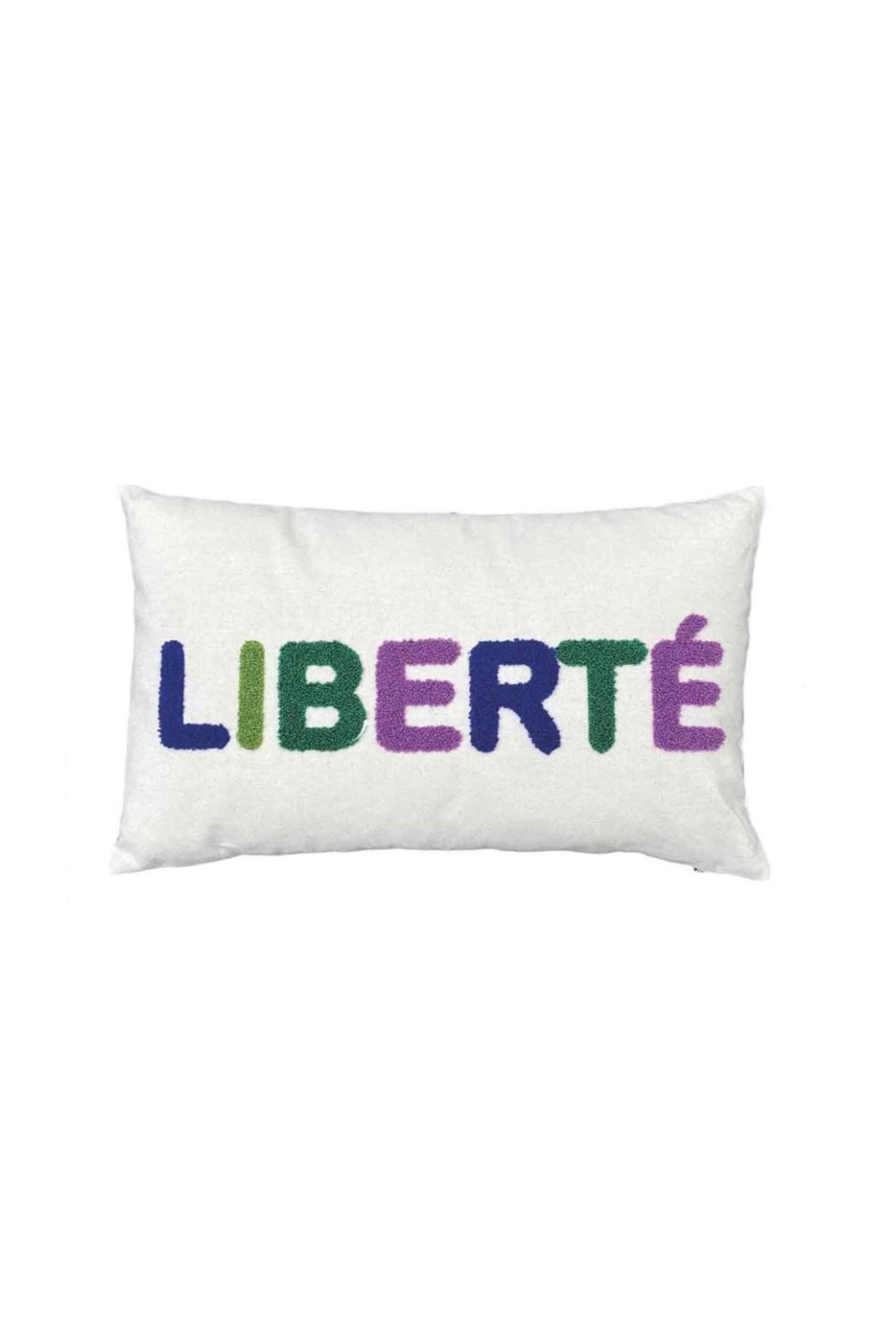 Un coussin en toile épaisse naturelle avec le mot liberté brodé bouclette, chaque lettre a sa couleur... Le message est passé.