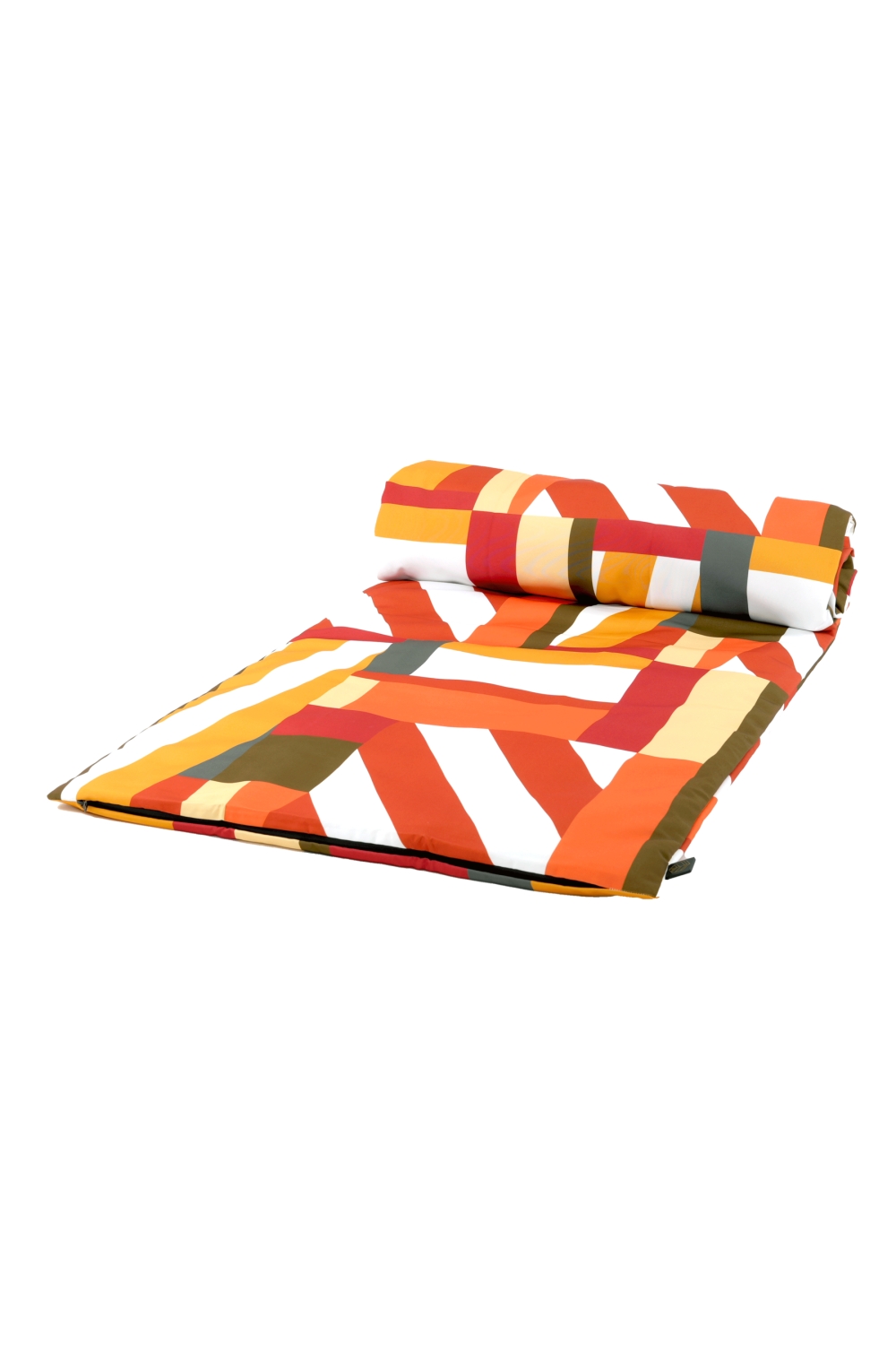 Le bain de soleil Pondichéry apporte une touche graphique et contemporaine à vos espaces extérieurs. Son motif géométrique, composé de bandes et de formes colorées, structure visuellement un salon de jardin tout en lui donnant du caractère.