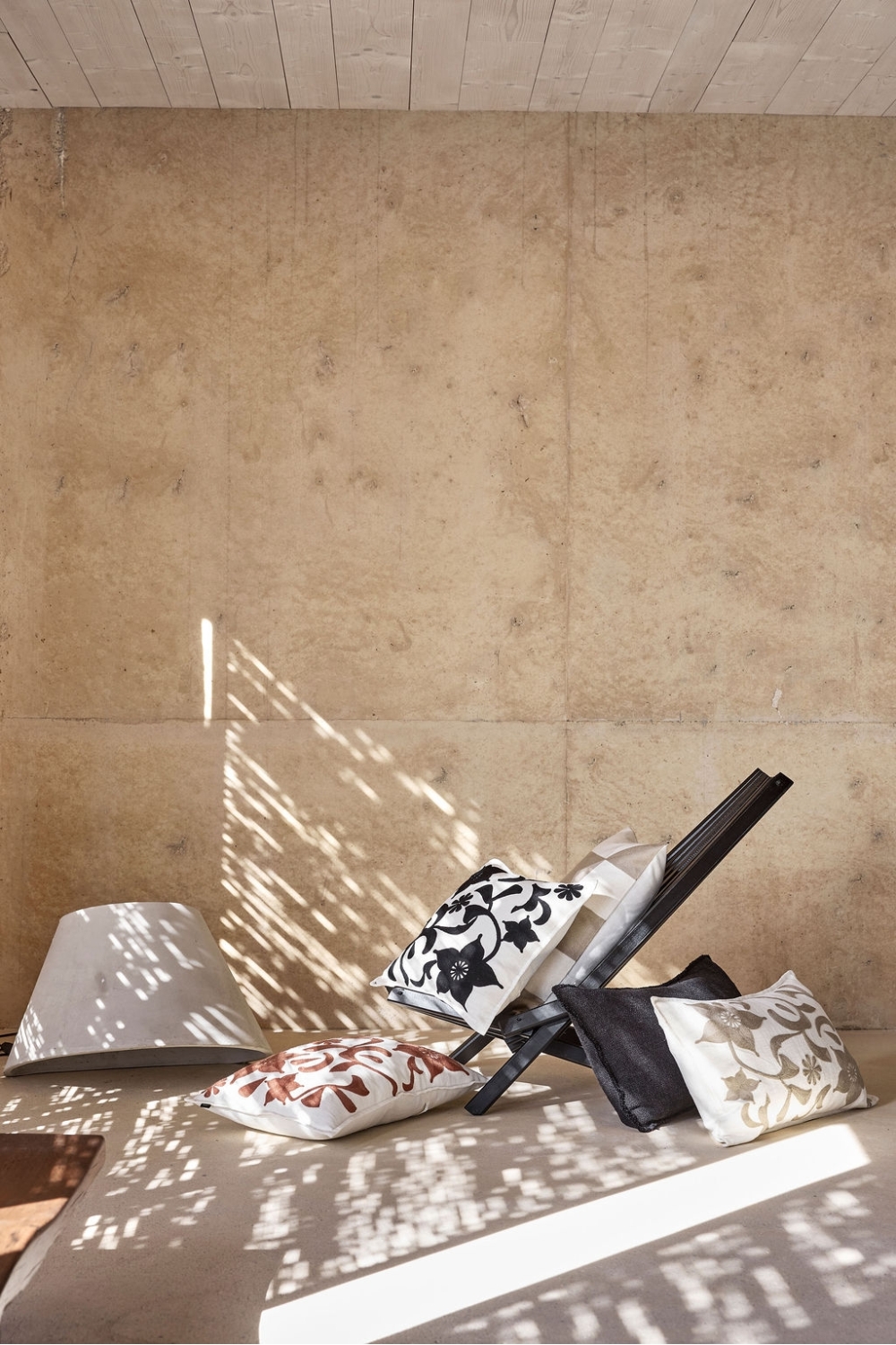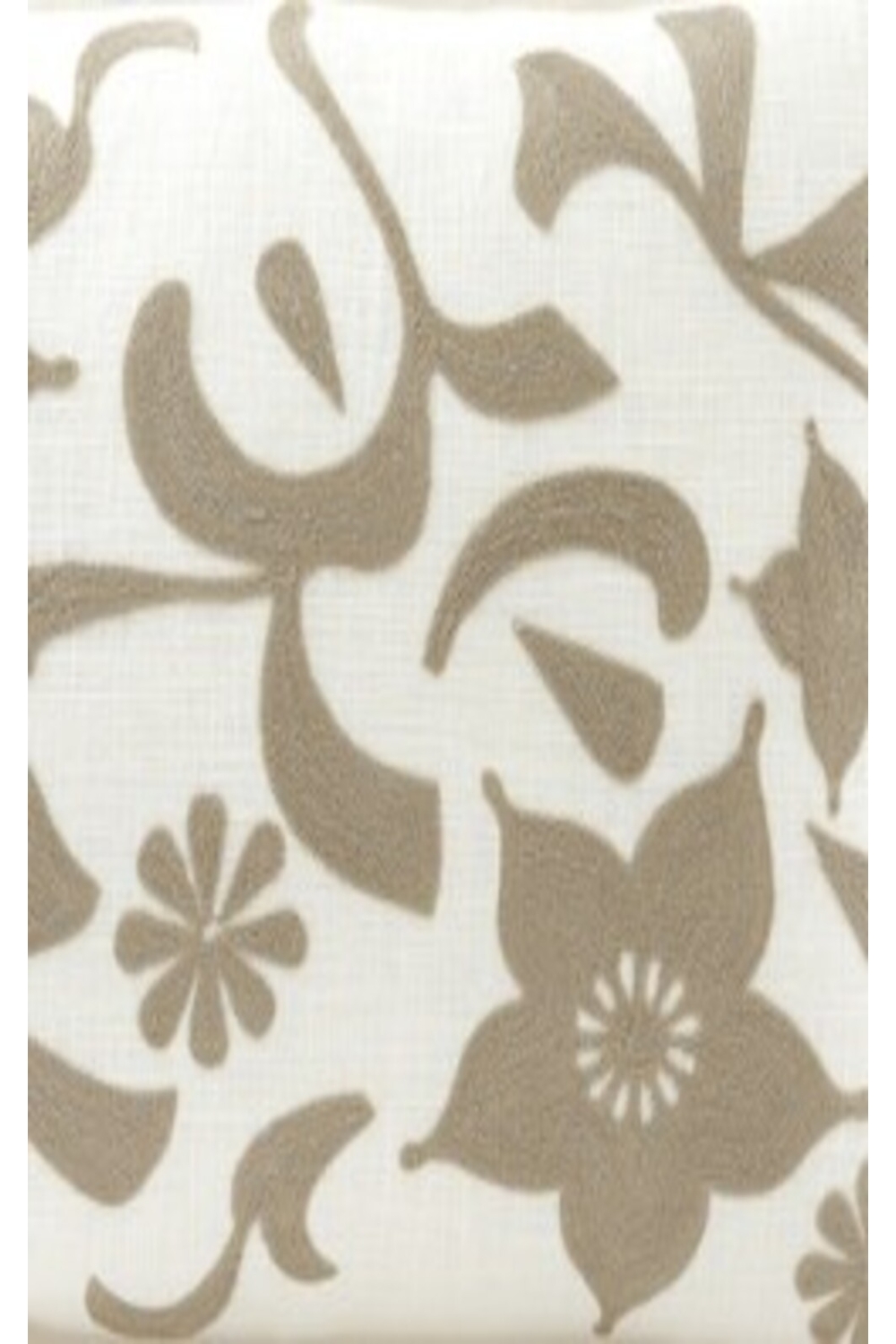 Sur une face, les arabesques se déclinent dans des tons lin, mocaccino et noir, brodés sur un fond blanc lumineux.
