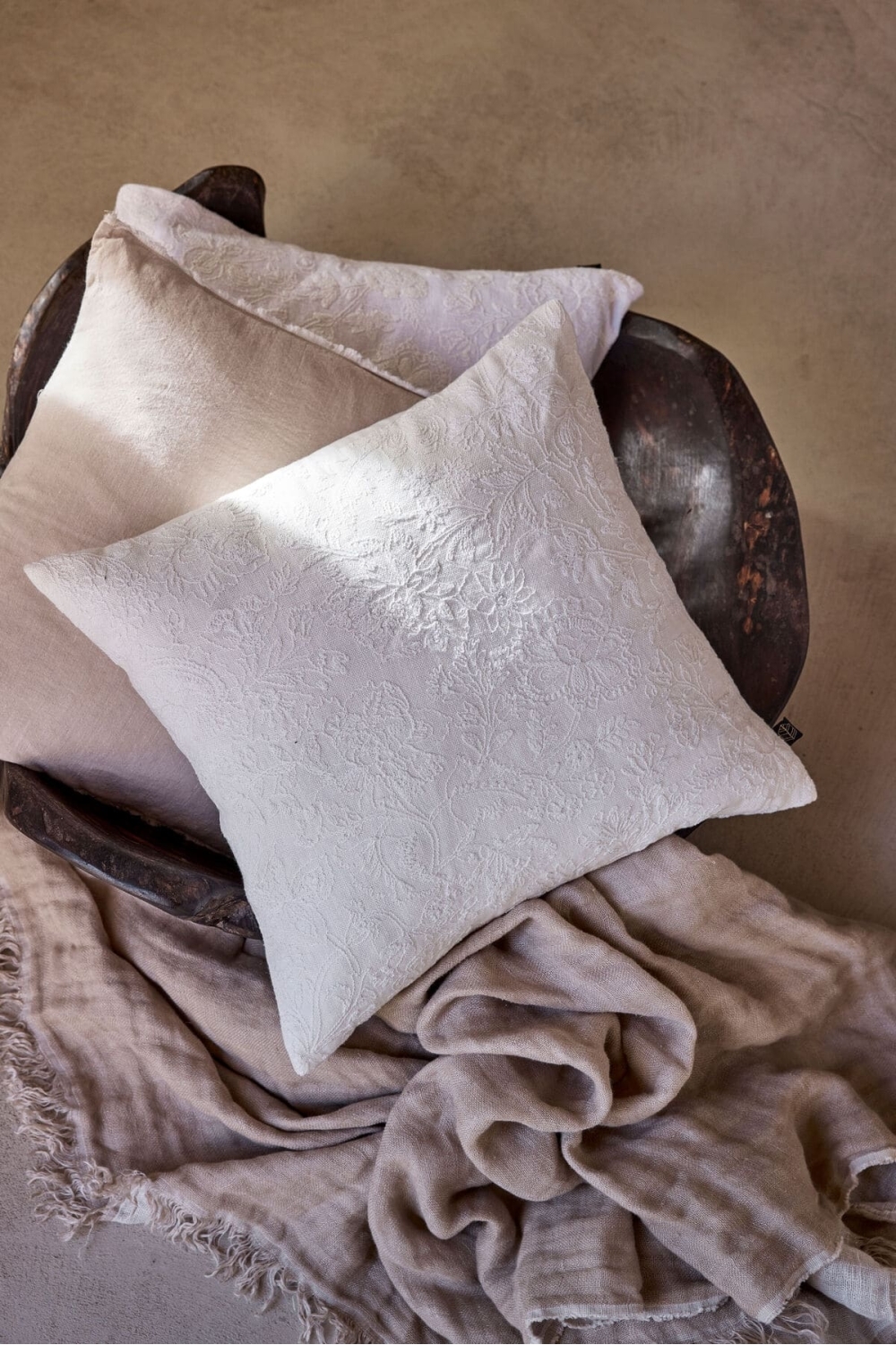 Le coussin Phoenix de chez Haomy séduit par son élégance et son travail de texture tout en finesse.