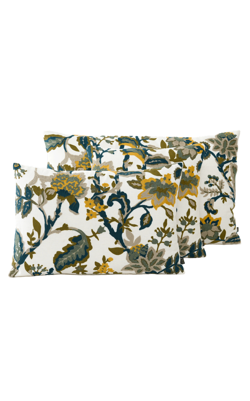Ces coussins sont confectionnés en 100% coton, avec un fond blanc lumineux sur lequel se déploie un motif floral délicatment brodé avec une grande précision.