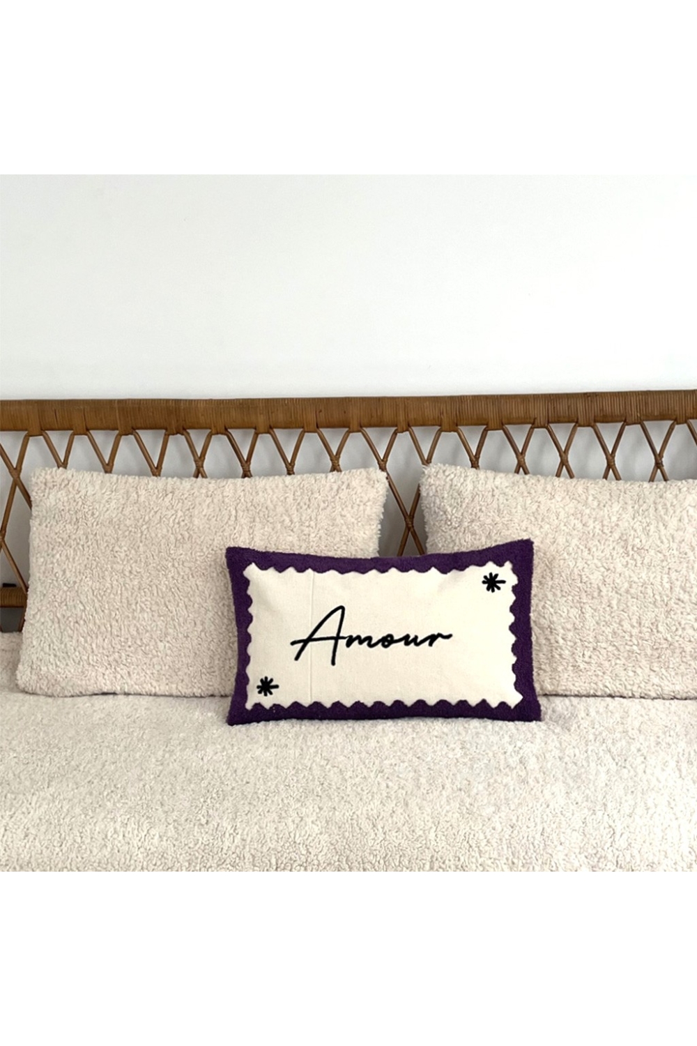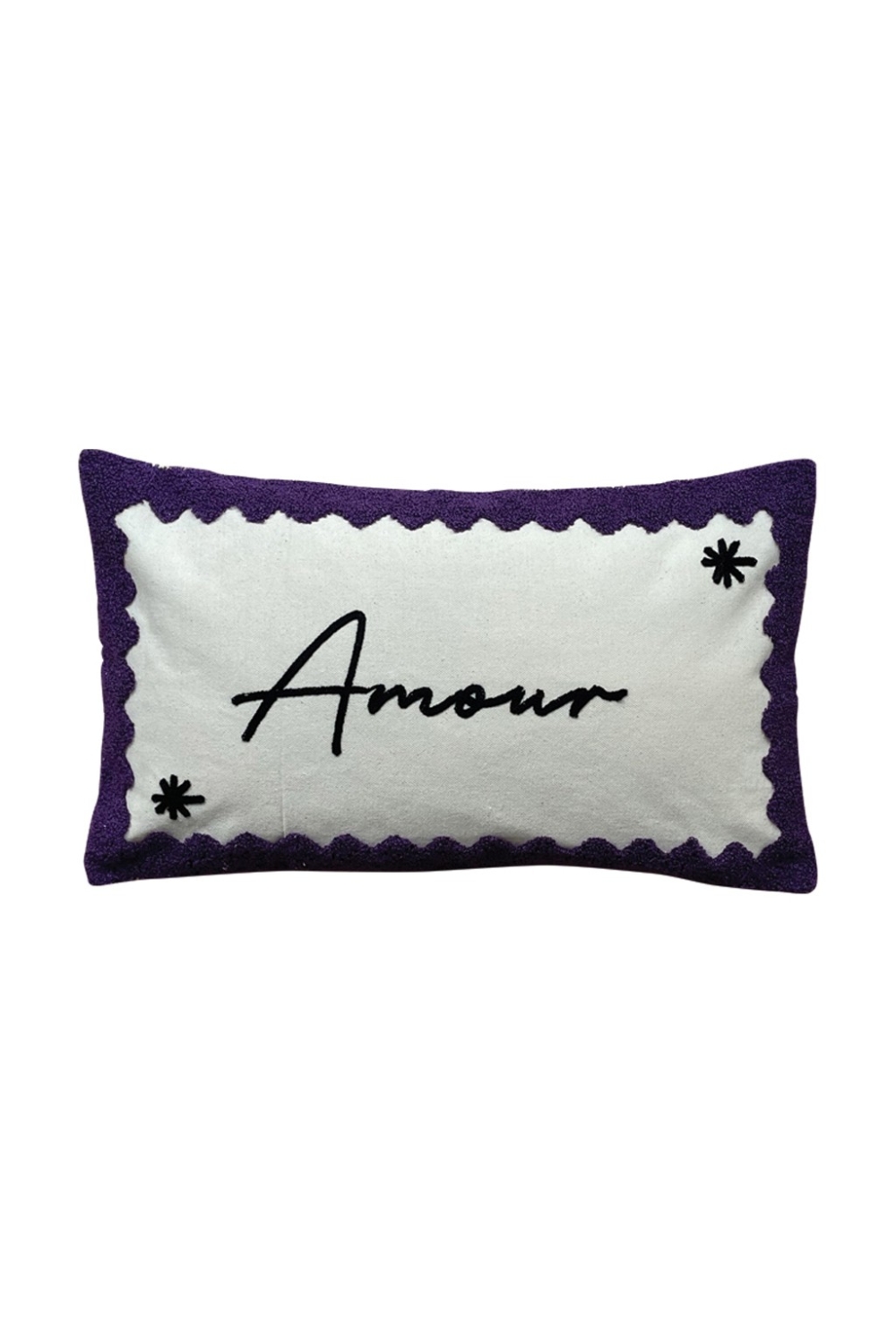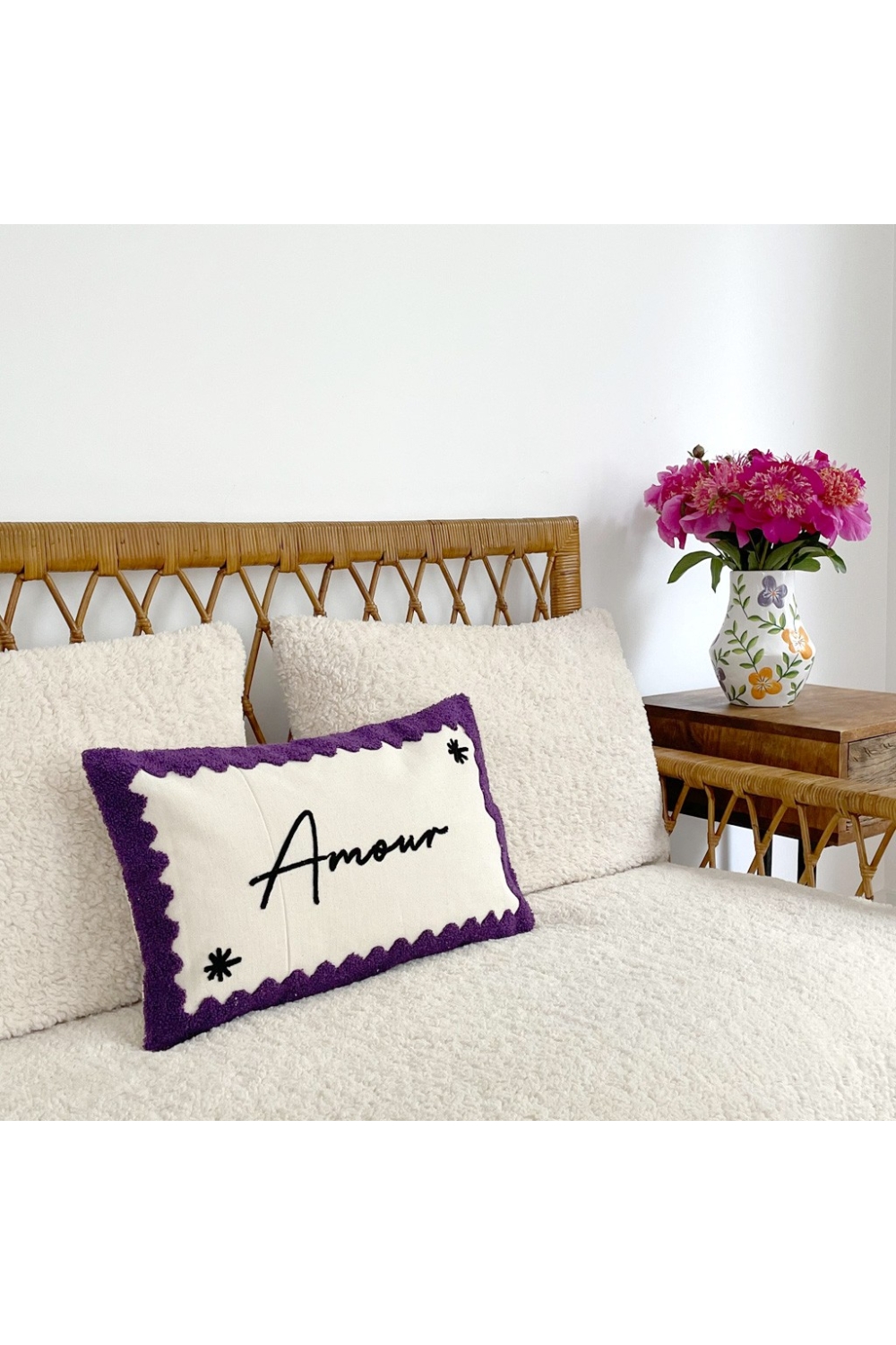 Un coussin en toile épaisse naturelle avec le mot Amour brodé... Le message est passé.