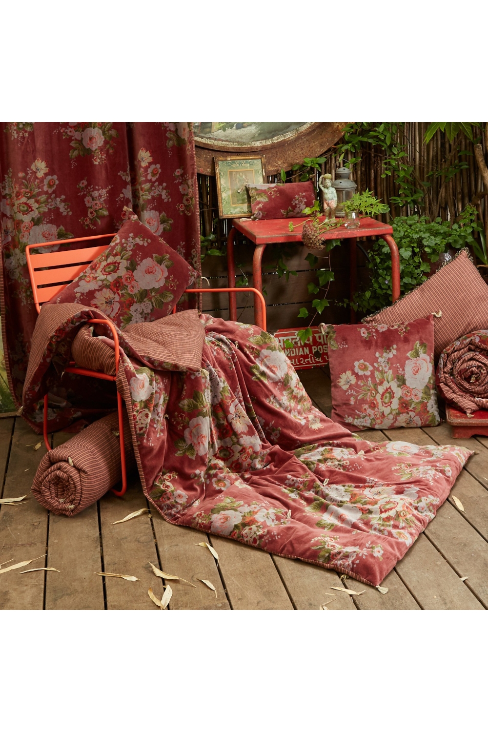 Ici, l'édredon Bangalore 90x200 dans sa version velours de coton imprimé floral sur fond terracotta et son motif à rayures coordonné au dos ! On adoooore !