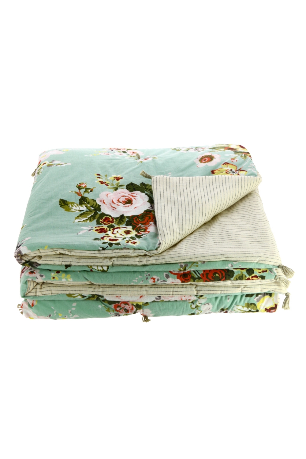 Ici, le chemin de lit Bangalore dans sa version estivale en toile de coton imprimé floral sur fond céladon et son motif à fines rayures ébènes sur fond naturel au dos !