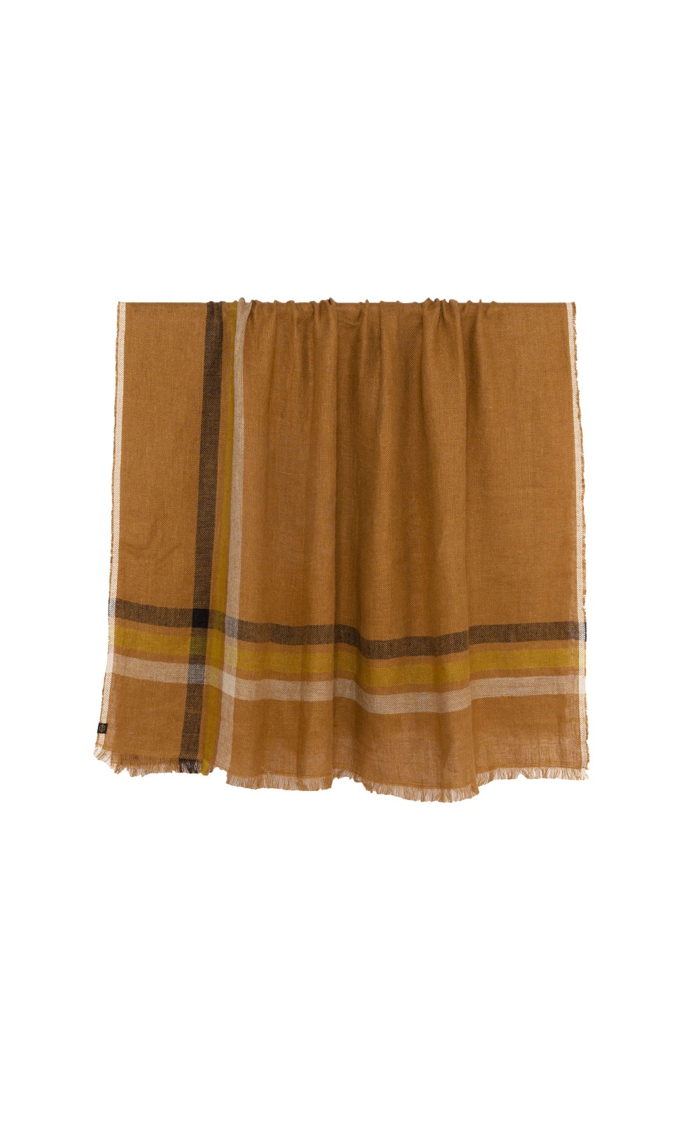 Le plaid ou jeté de lit Malibu est en 100% lin lavé. Il mesure 135x190 cm. Il a 3 magnifiques rayures parallèles sur les deux côtés, qui se croisent en bas sur le côté du plaid.