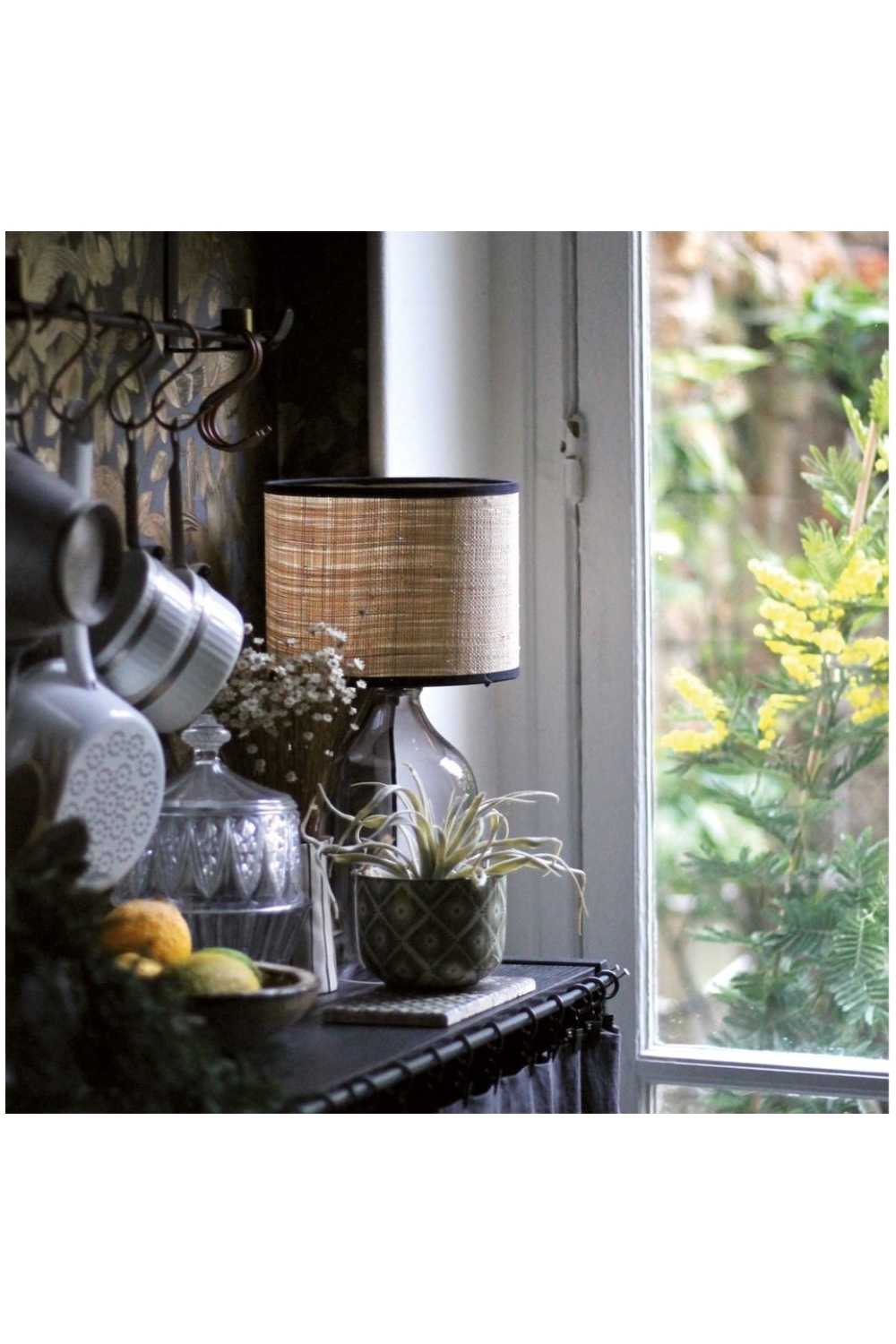Son abat-jour en raphia naturel diffuse une lumière douce et chaleureuse, avec un