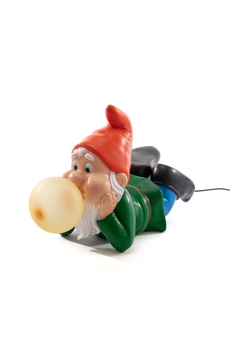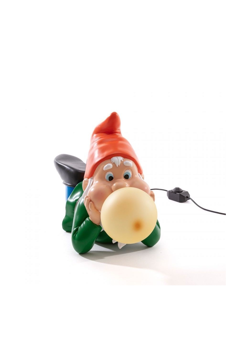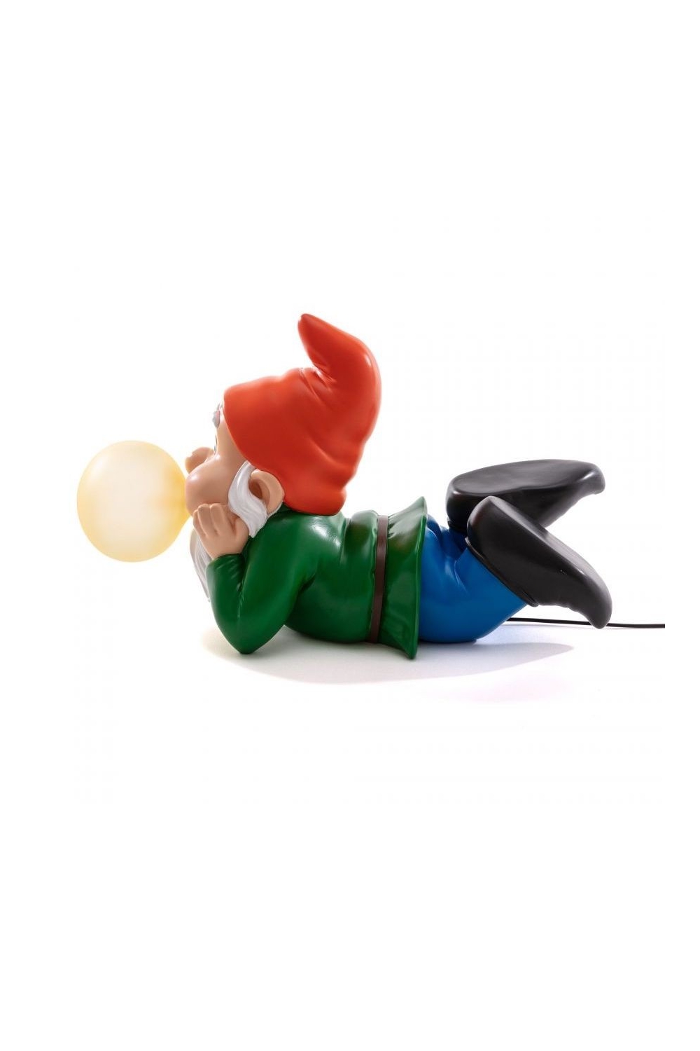 Nouveauté de la marque Seletti ! Avec un goût particulier pour l’univers du kitsch, c’est les nains de jardin cette-fois ci qui sont à l’honneur, 3 modèles différents sont proposés. L’éclairage de ces lampes d’ambiances vient de la bulle de chewing-gum qui sort de leur bouche. Ici c’est le modèle rêveur, allongé, avec un bonnet rouge et une ampoule jaune.