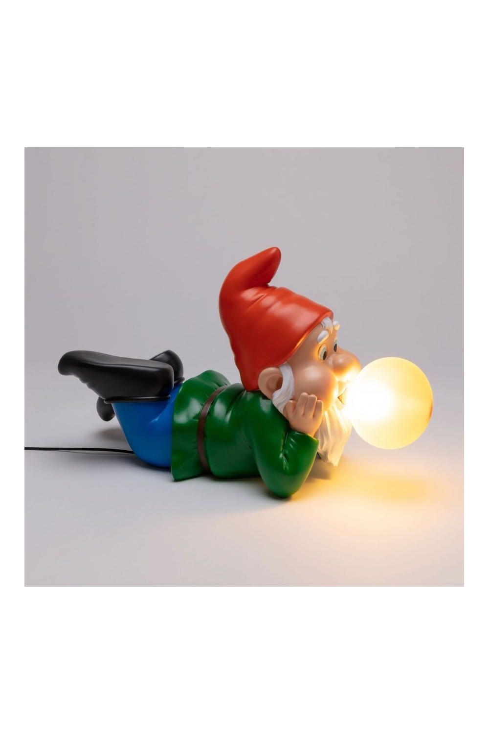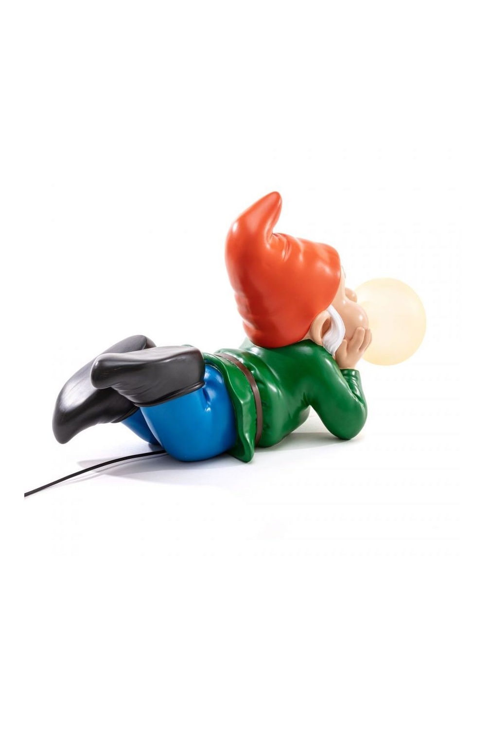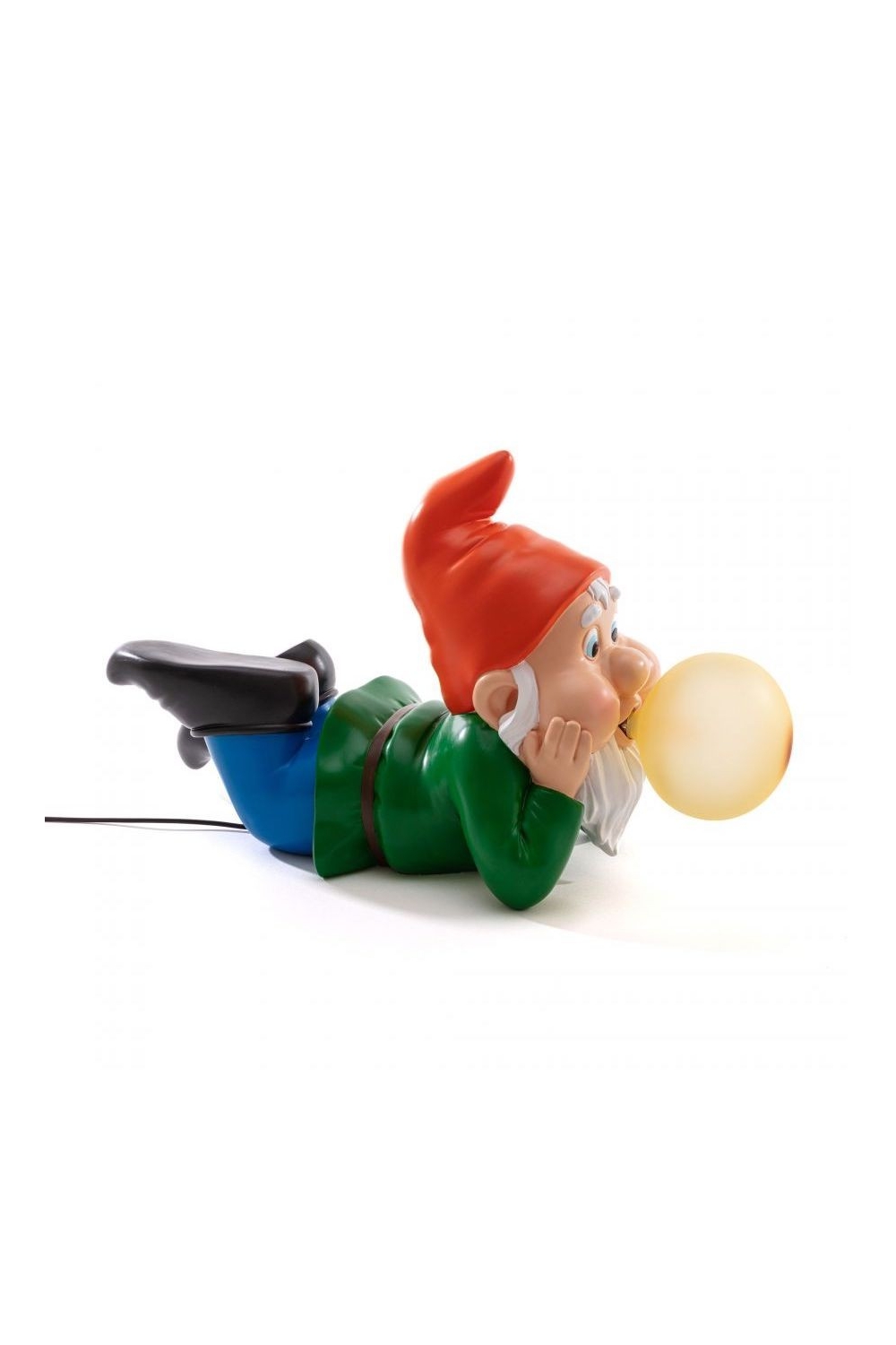 Nouveauté de la marque Seletti ! Avec un goût particulier pour l’univers du kitsch, c’est les nains de jardin cette-fois ci qui sont à l’honneur, 3 modèles différents sont proposés. L’éclairage de ces lampes d’ambiances vient de la bulle de chewing-gum qui sort de leur bouche. Ici c’est le modèle rêveur, allongé, avec un bonnet rouge et une ampoule jaune.