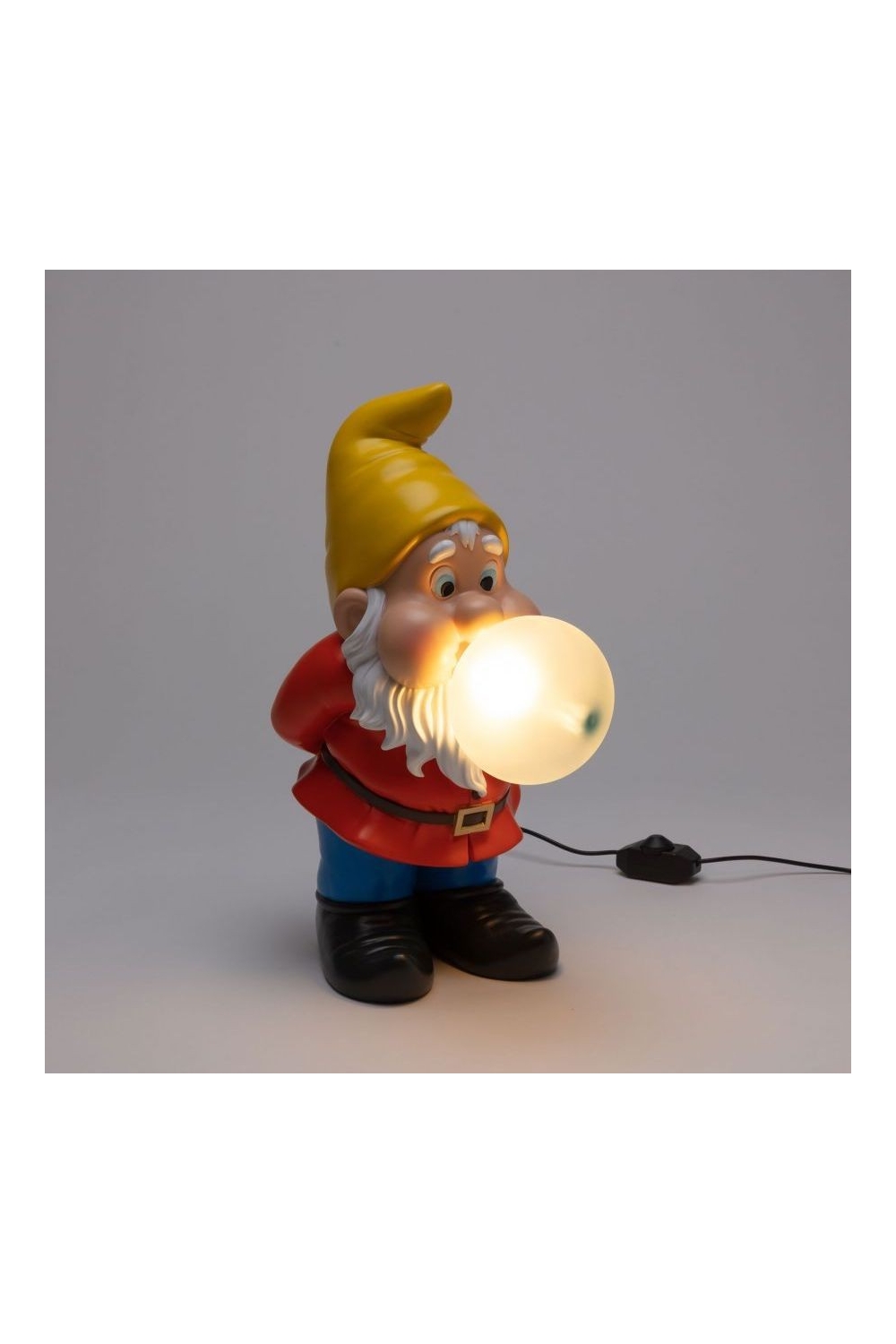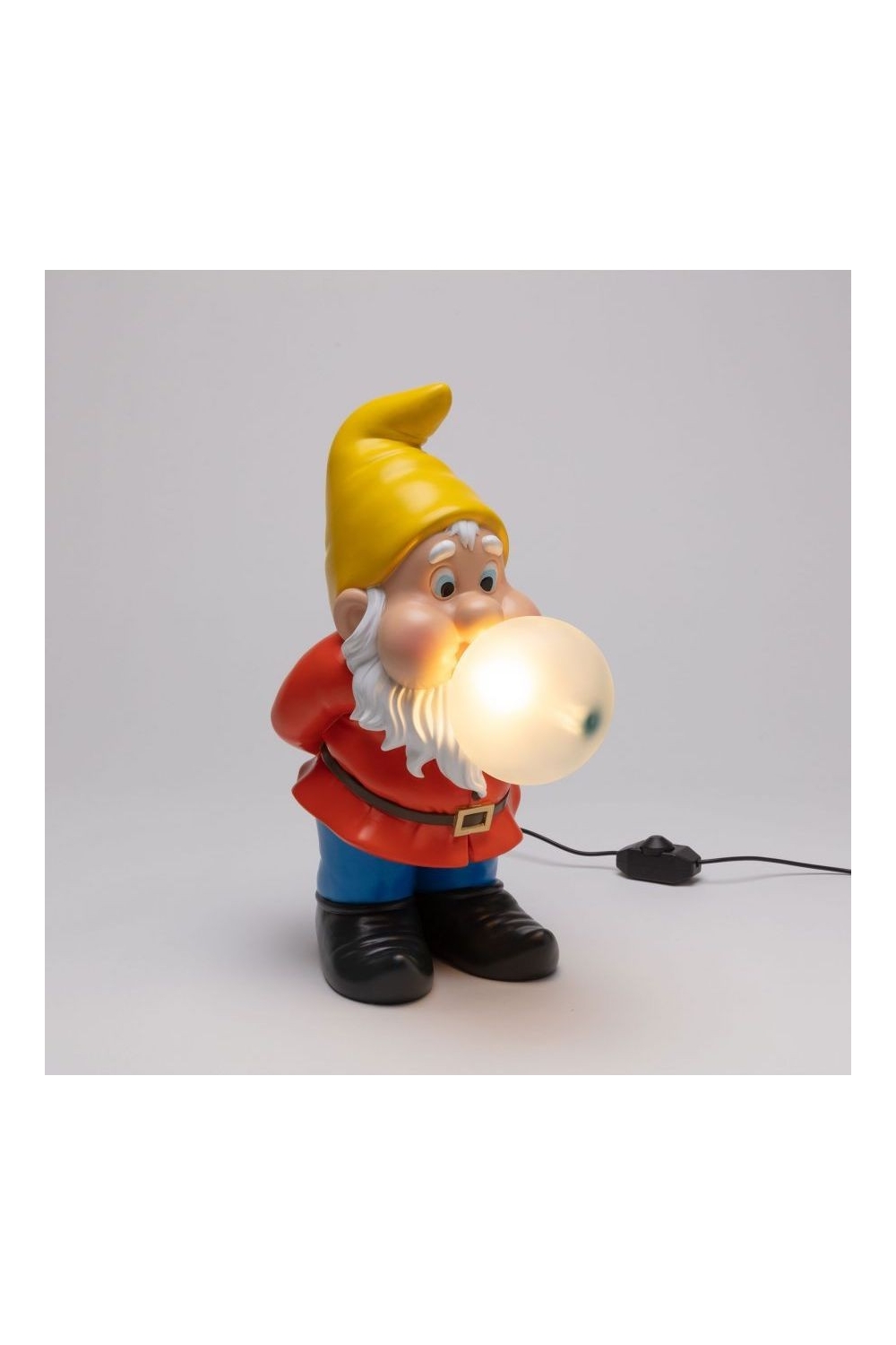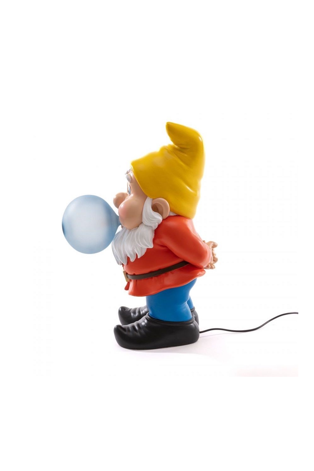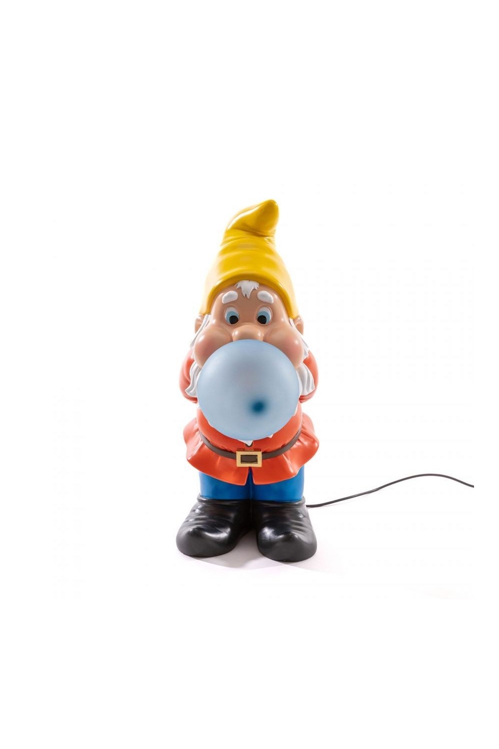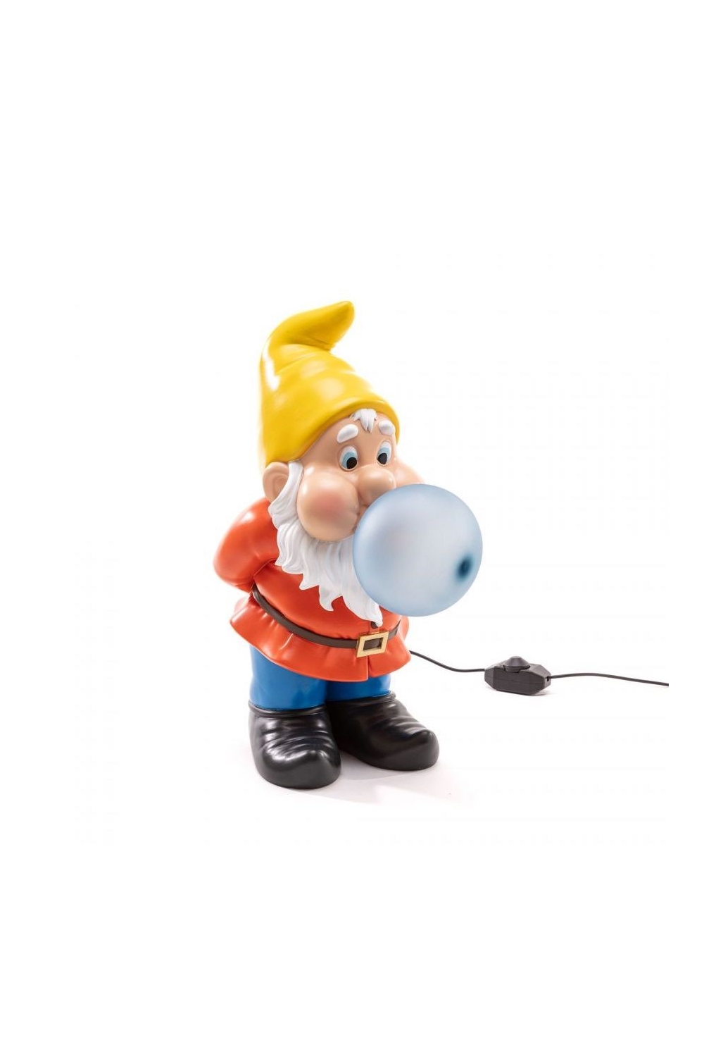 Nouveauté de la marque Seletti ! Avec un goût particulier pour l’univers du kitsch, c’est les nains de jardin cette-fois ci qui sont à l’honneur, 3 modèles différents sont proposés. L’éclairage de ces lampes d’ambiances vient de la bulle de chewing-gum qui sort de leur bouche. L’ampoule émet une lumière diffuse à intensité variable. Ici c’est le modèle espion, debout, avec un bonnet jaune et une ampoule bleue.