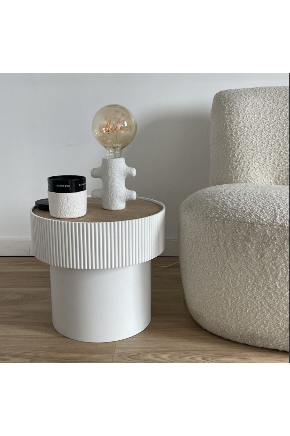 Fabriquée en faïence, cette lampe imite subtilement l'aspect du papier mâché ou de la faïence brute, créant une esthétique à la fois délicate et contemporaine.