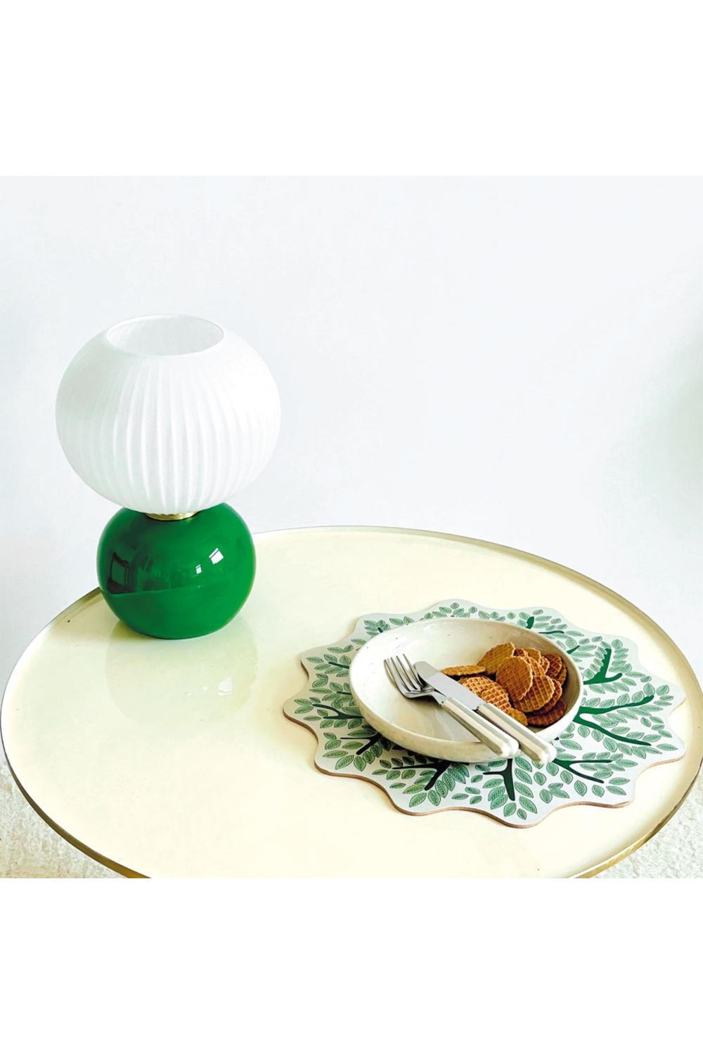 Son pied rond en verre teinté se décline dans une palette de couleurs raffinées : blanc, vert, orange, marron et jaune, apportant une touche de gaieté et de lumière à votre intérieur.
