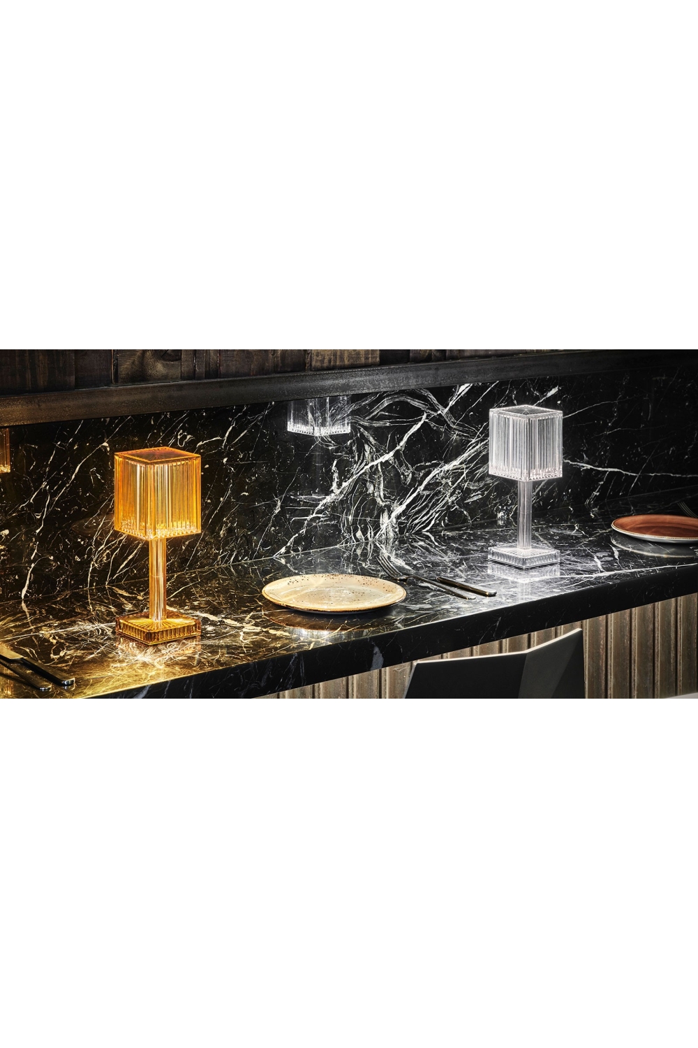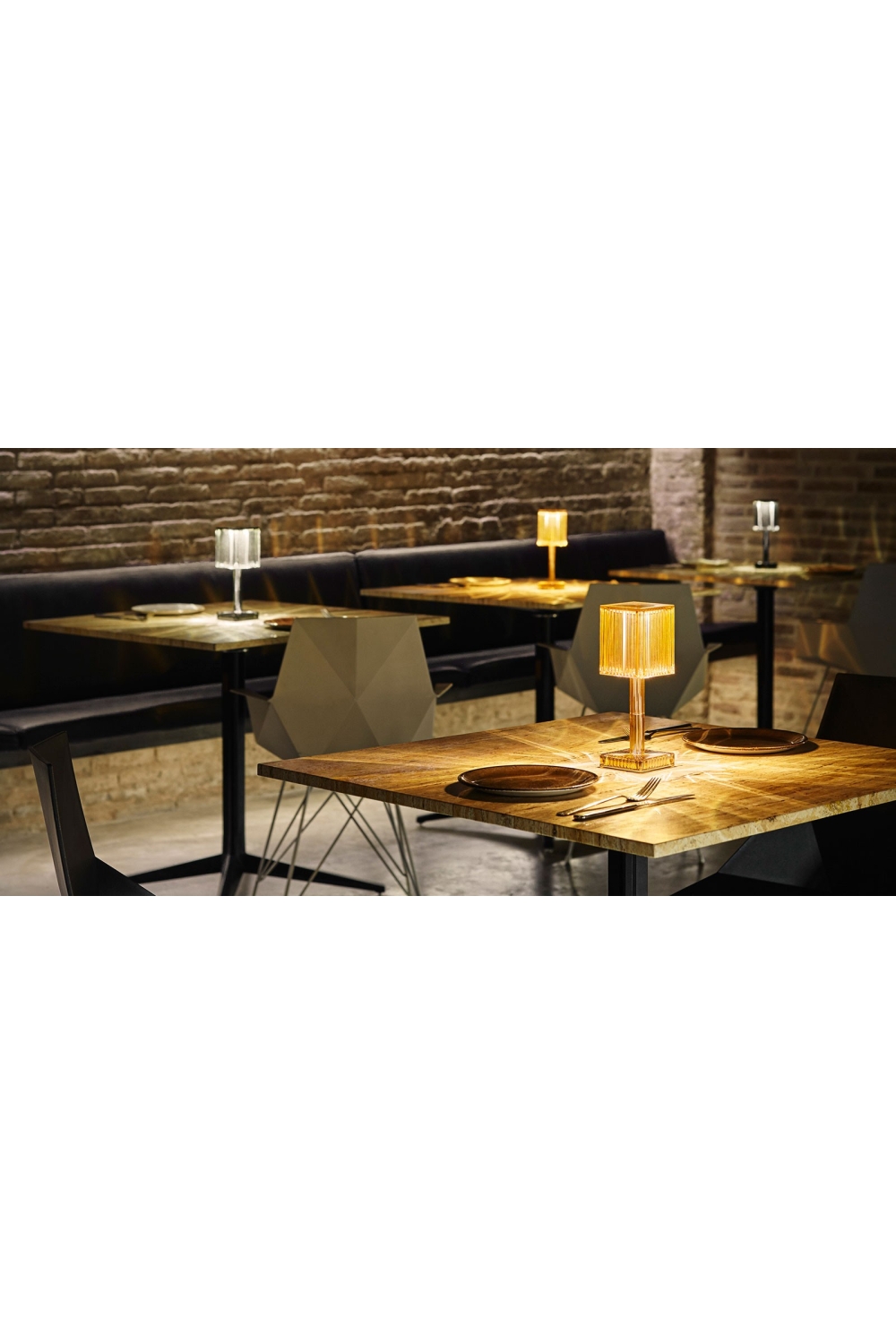 La collection GATSBY, dessinée par Ramón Esteve pour VONDOM, est une réminiscence de l’illumination de l’Art Déco. La lampe naît de l’idée de créer une atmosphère enveloppante à travers un jeu suggestif de lumières, produit par les surfaces de la lampe, où le matériau reproduit la forme et les sensations du verre gravé.