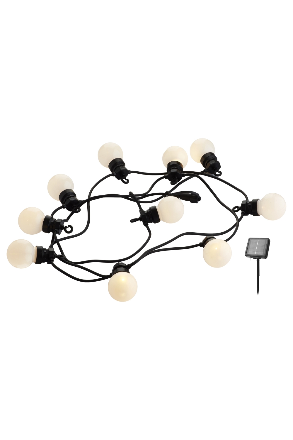 Les 10 ampoules ont un diamètre de 4,5 cm et sont espacées de 25 cm sur un total de 3 mètres, le câble de branchement au panneau solaire mesure 3 mètres.