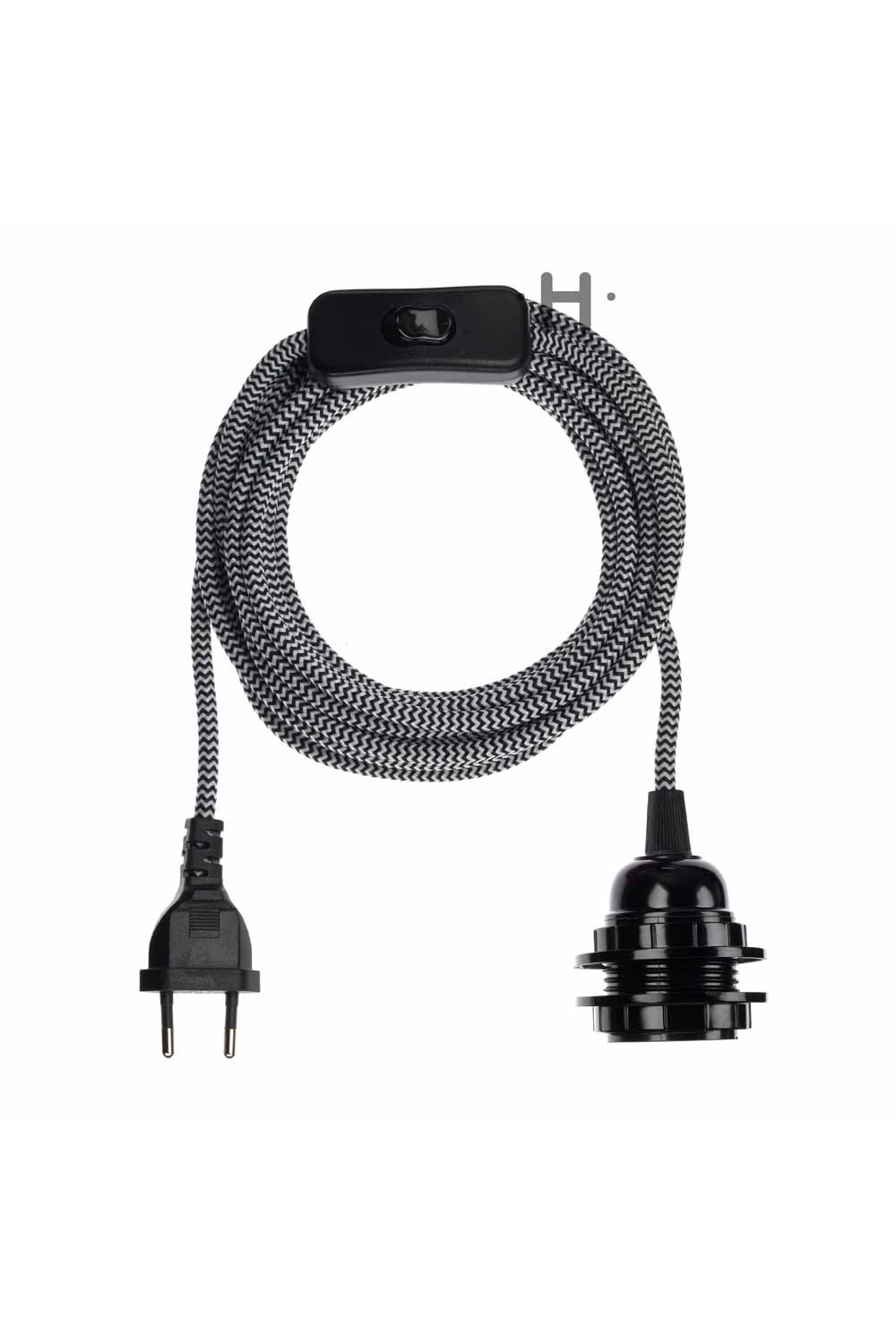 - Matériaux: douille plastique double bague, câble textile longueur totale 4m50, interrupteur et prise 2 broches