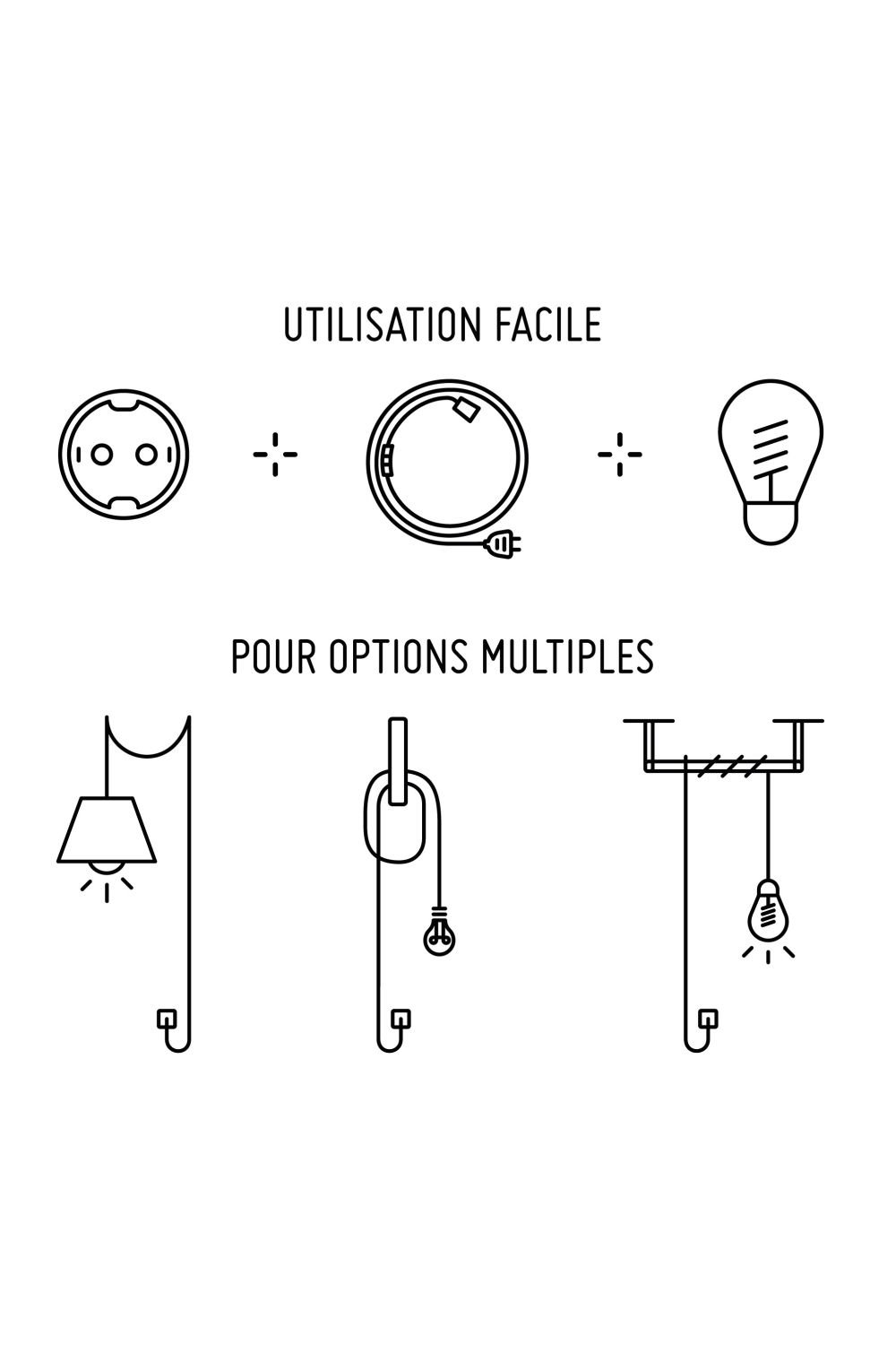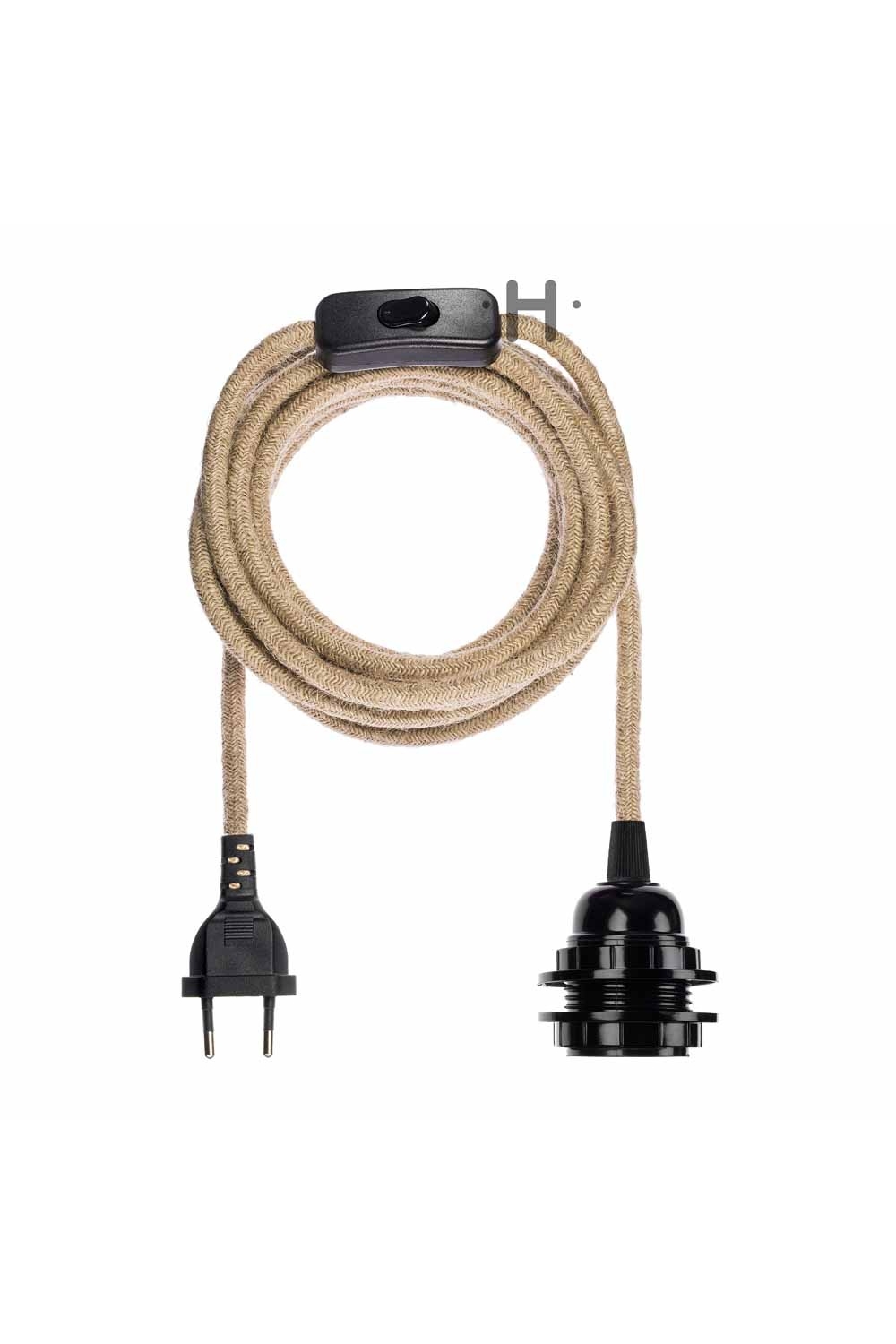 - Matériaux: douille plastique double bague, câble textile longueur totale 4m50, interrupteur et prise 2 broches
