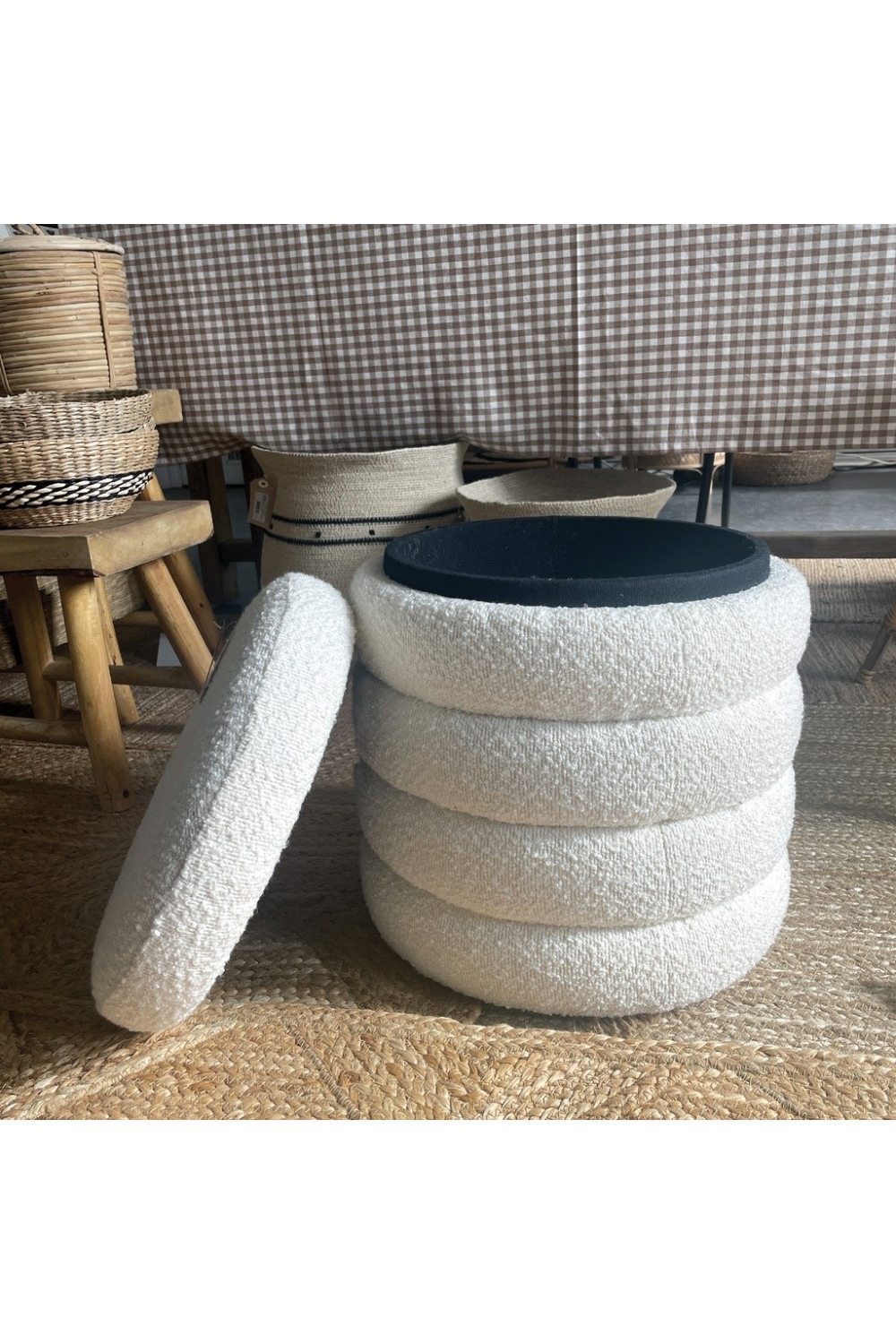 Le tabouret est un élément de déco incontestable et tellement pratique. En plus d'être un tabouret il fait coffre, il vous suffit d'enlever le couvercle pour le remplir . Le tabouret Noé est revêtu d'un tissu en bouclette.